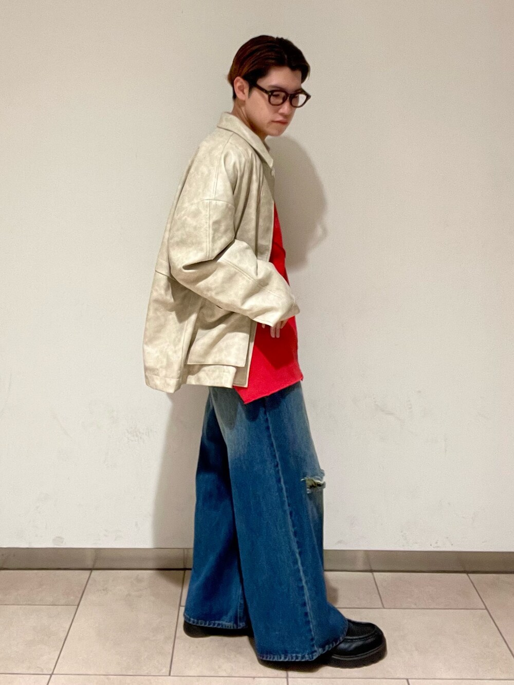 ジャケットはヴィンテージライクなムラのあるフェイクレザーで生地が柔らかいのでストレスなく着用いただけます👍