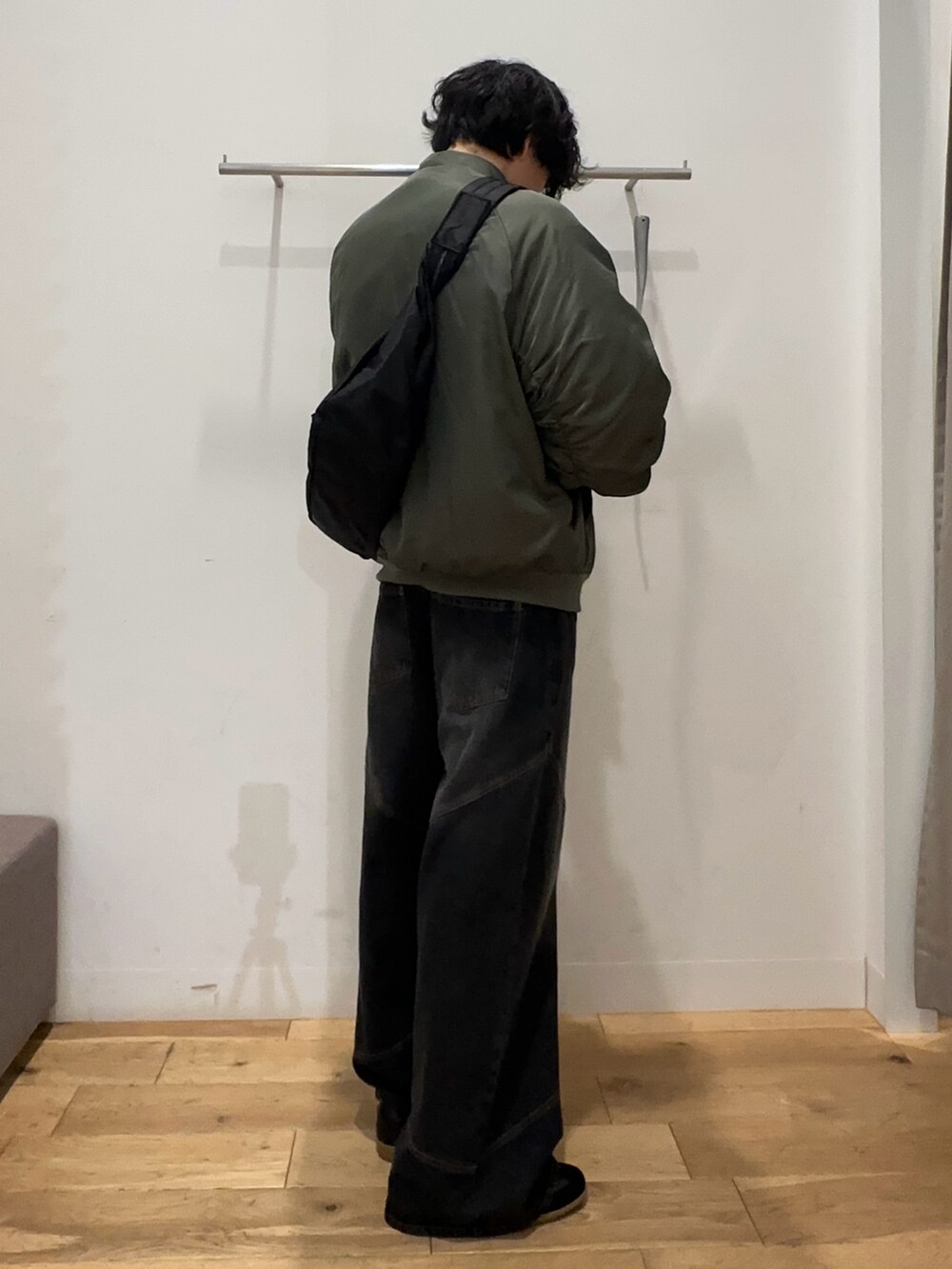 全体的にカジュアルに感じたので、足元にもスニーカーを合わせました。ボディバッグを背負うことでコーデに一癖加えました。