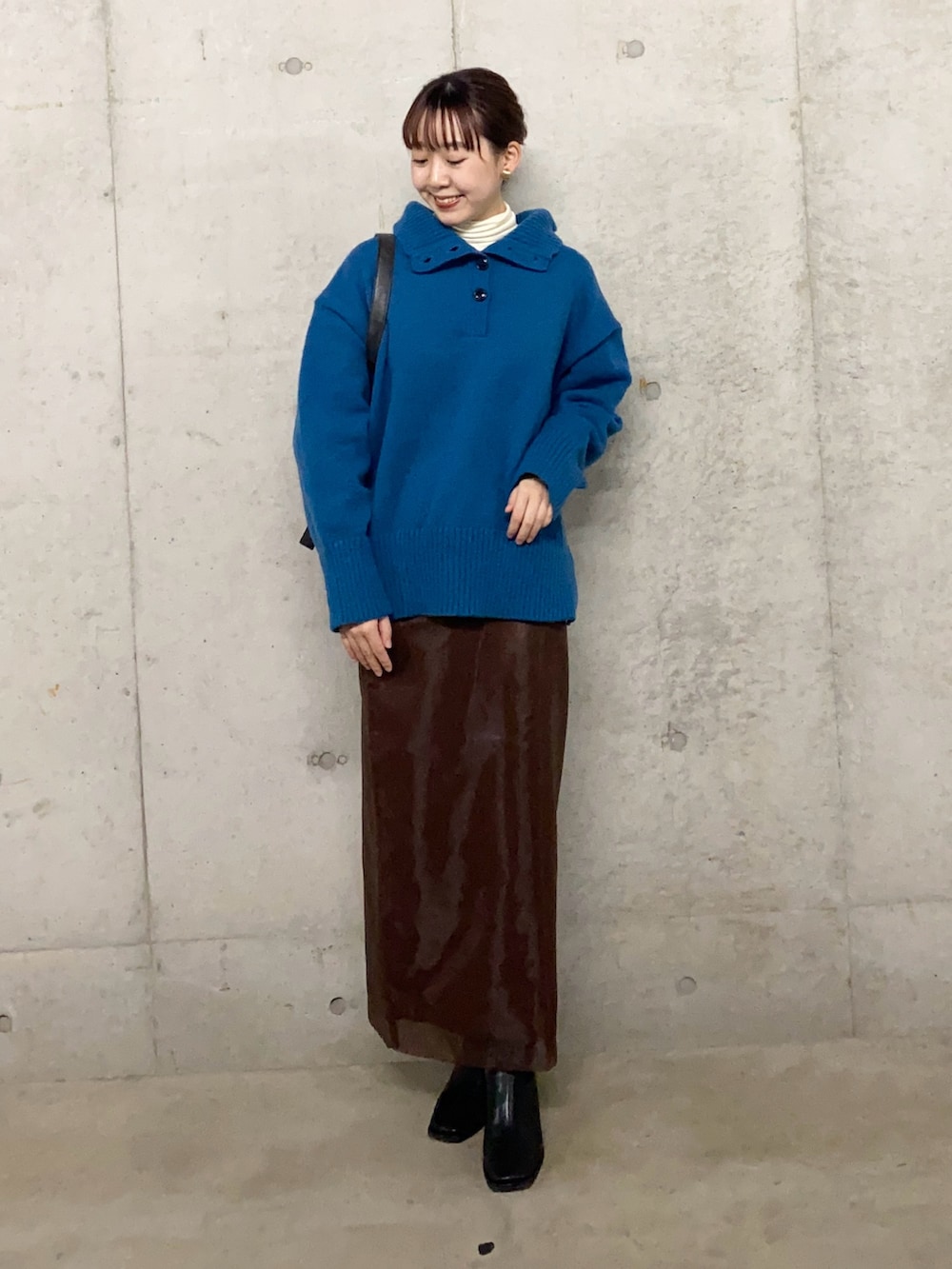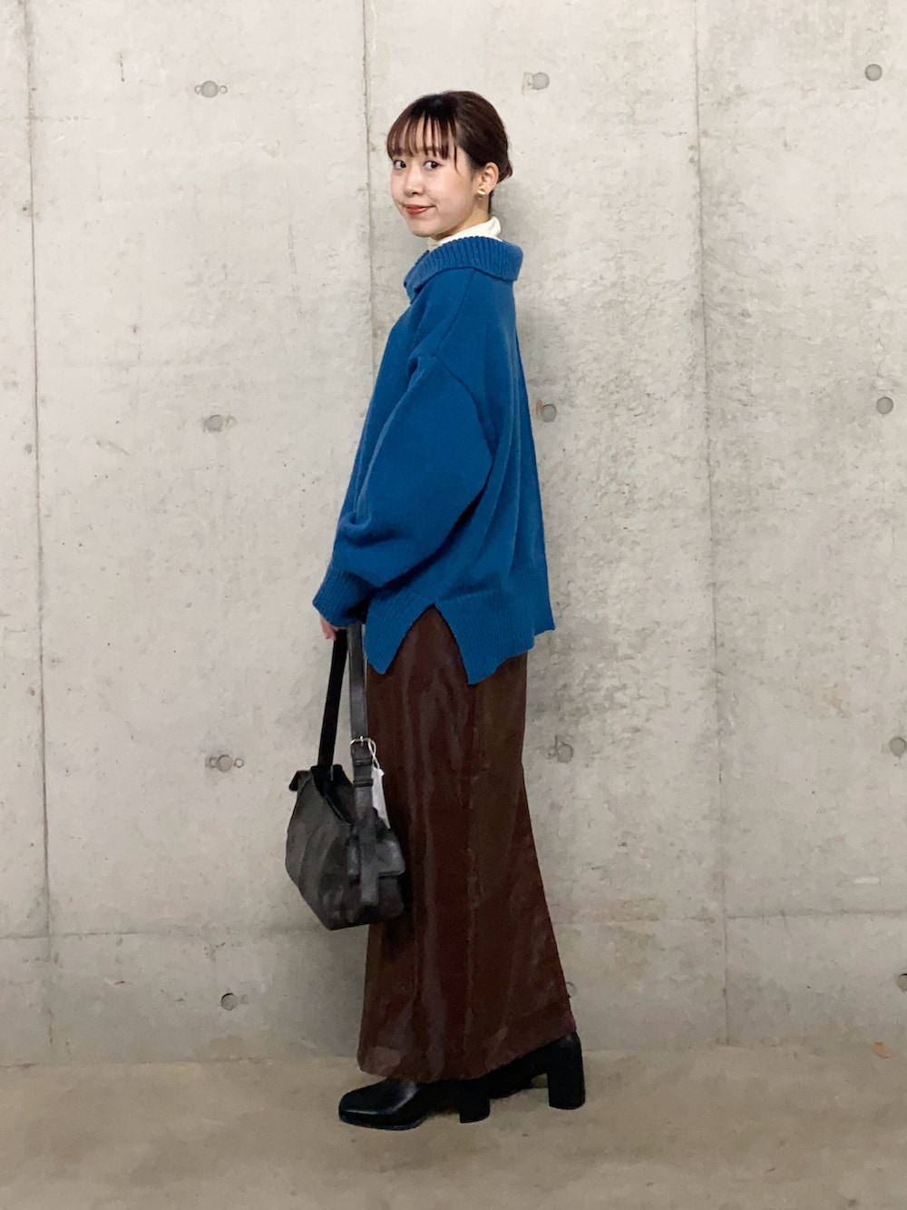 トップスのニットはボタン次第で襟をアレンジできちゃいます😍こっくりとした大人っぽブルーに心奪われちゃいます〜😭🙌✨️