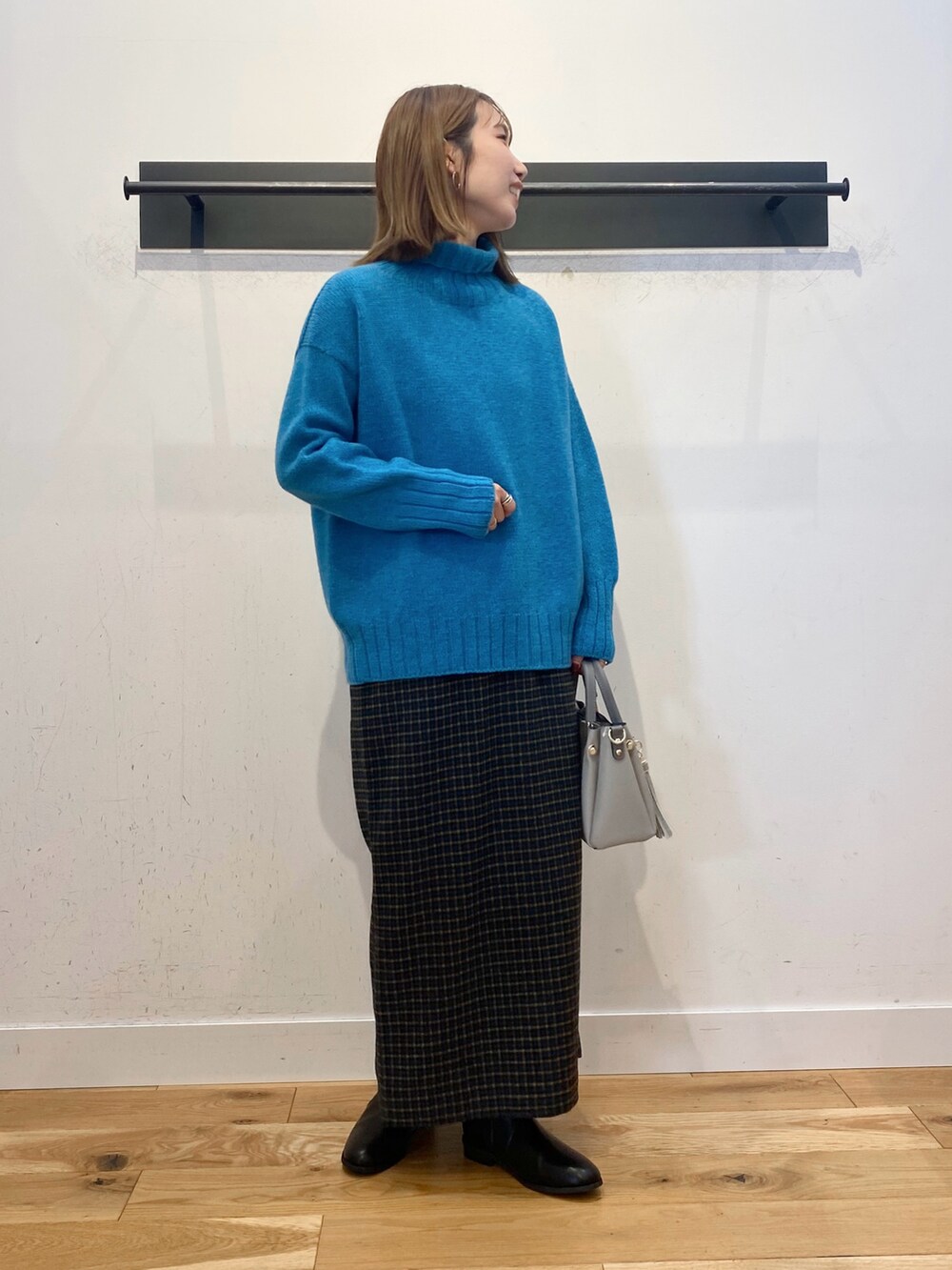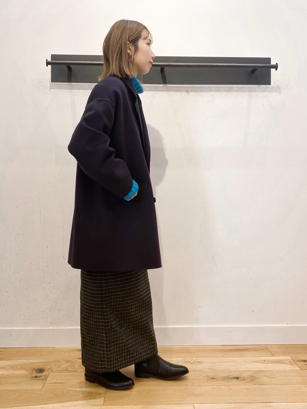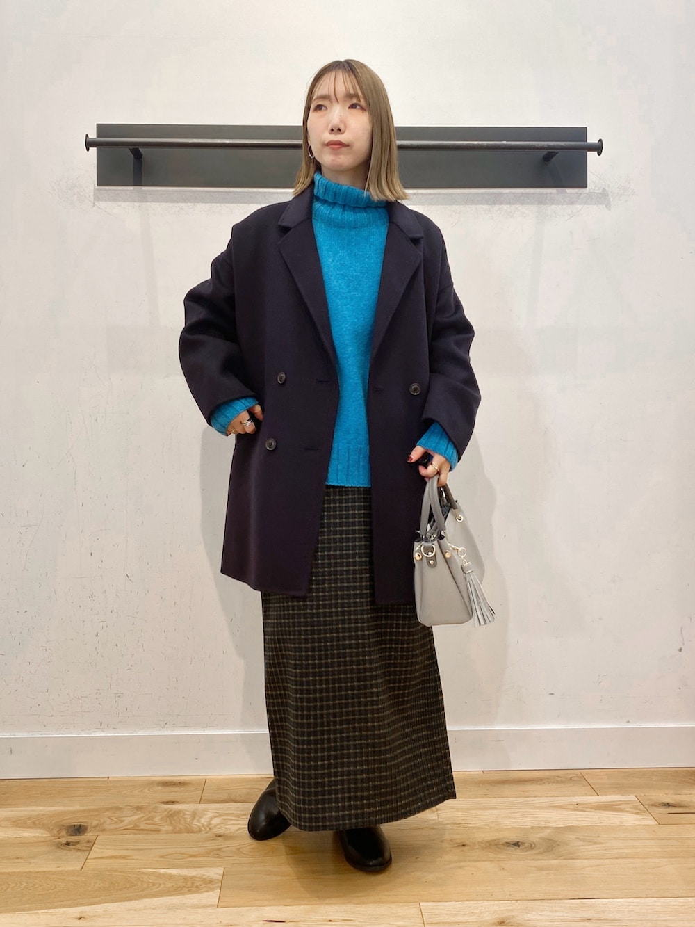 普段色味のあるものを着ない方にも挑戦しやすい青色。アウターとスカートもネイビーでまとめ、同系色で組んでみました。