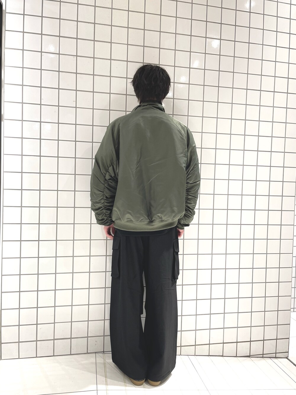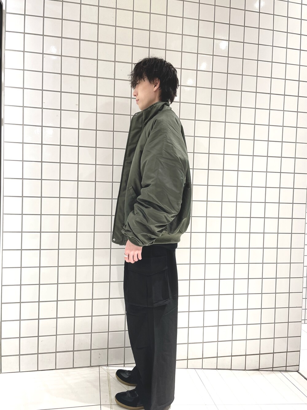 カーキのスタンドブルゾンを主役に他のアイテムはブラックでまとめて組みました。