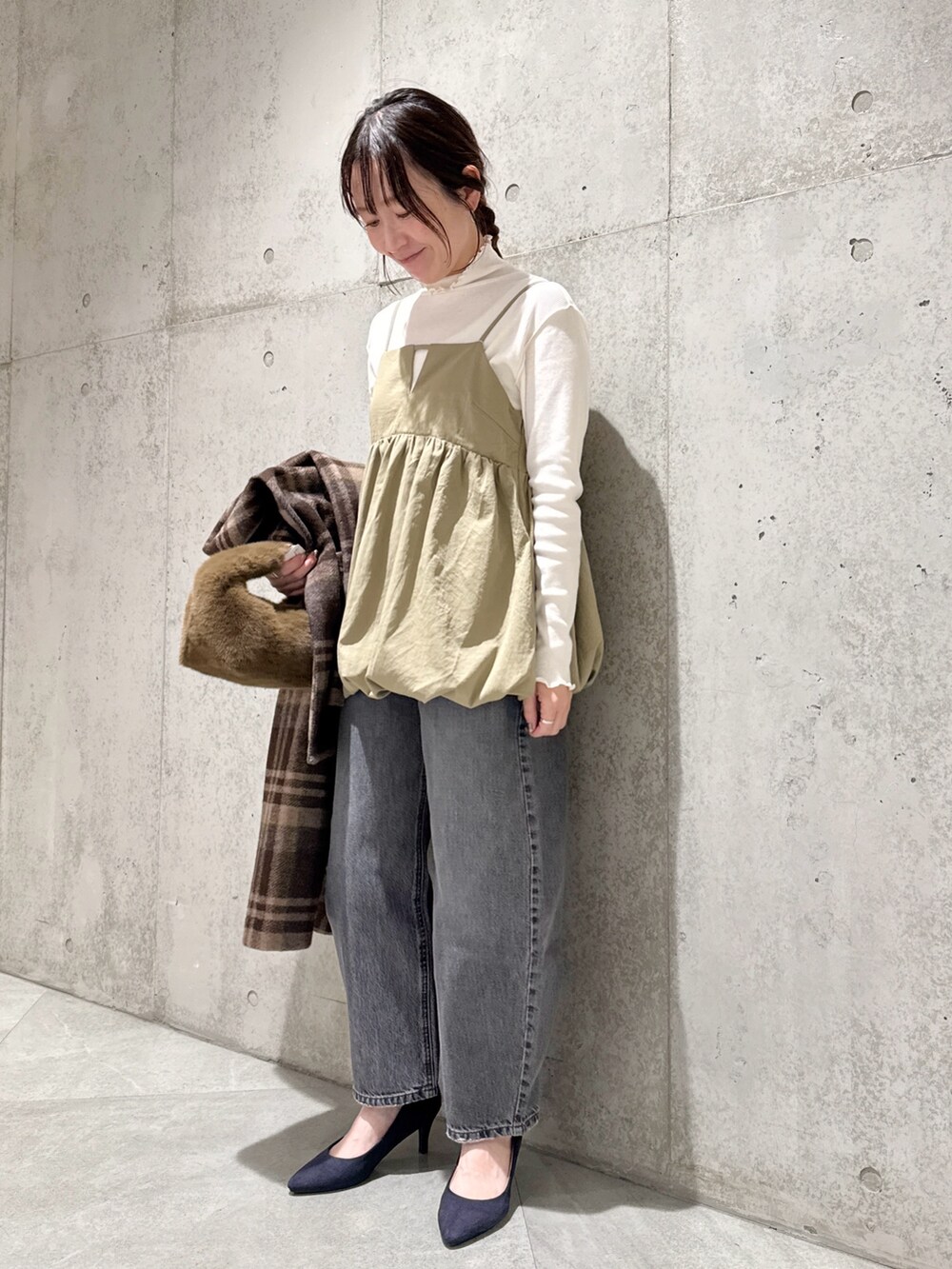 ウエスト周りはすっきりとしつつも、全体的にゆったりとしたボリューム感がポイント。