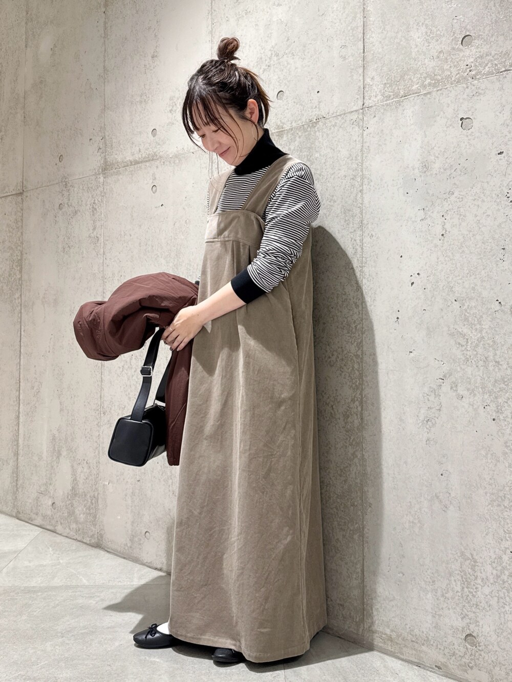 今回は、コーデュロイのジャンパーワンピースを合わせて、女性らしさをプラス。