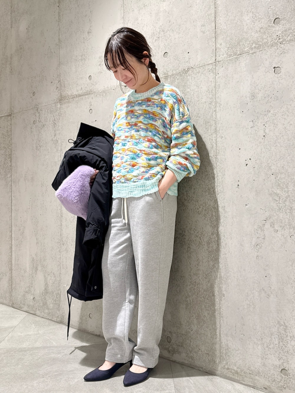 今回は、リラックスして穿いていただける、スウェットパンツに、カラフルなニットをアクセントにしたコーディネートです。