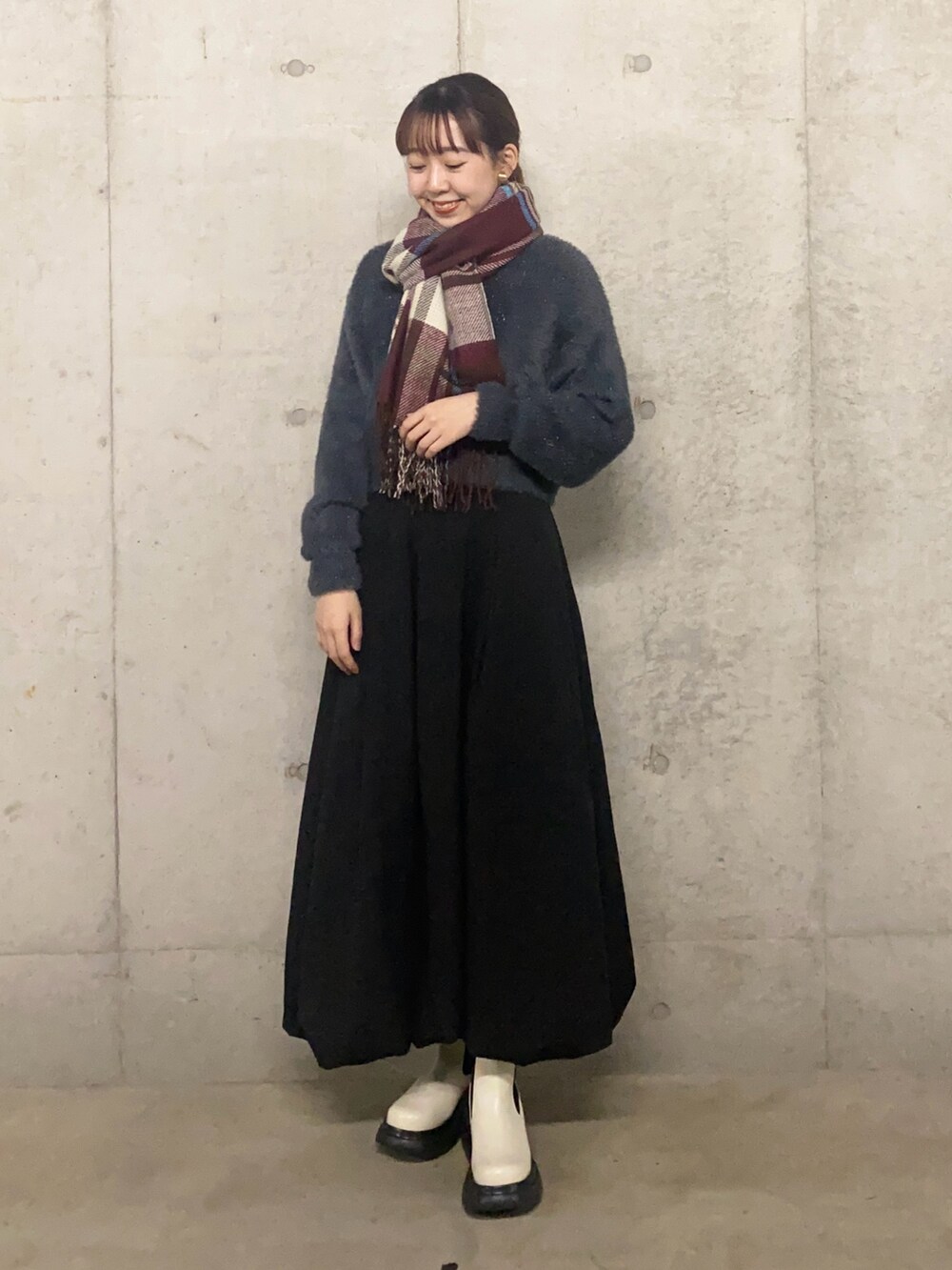 ラメなチャコールなので黒と合わせても重くなりません🙆♀️✨️また、クロップド丈で重心アップ!!軽やか冬コーデの完成です🥹