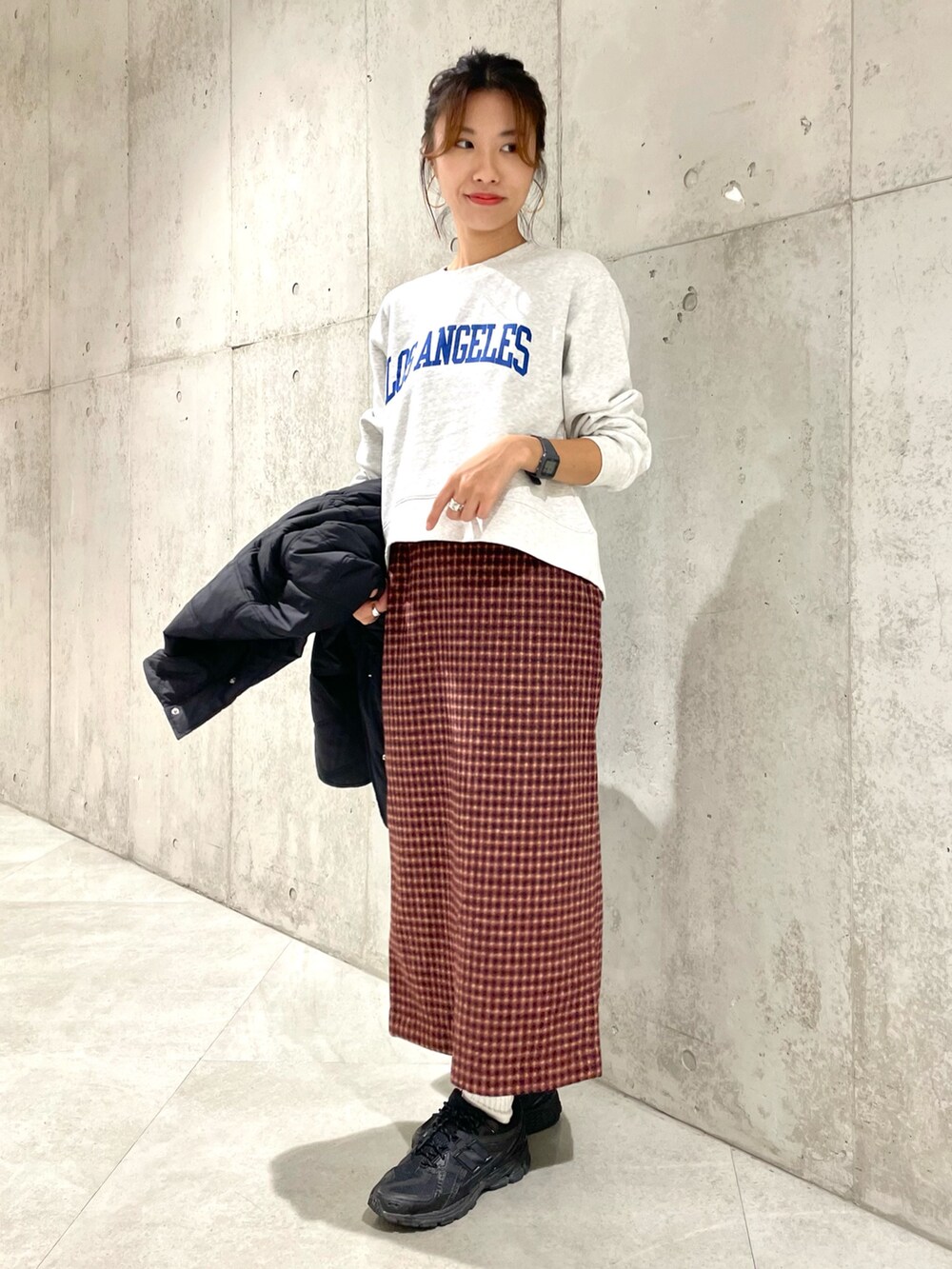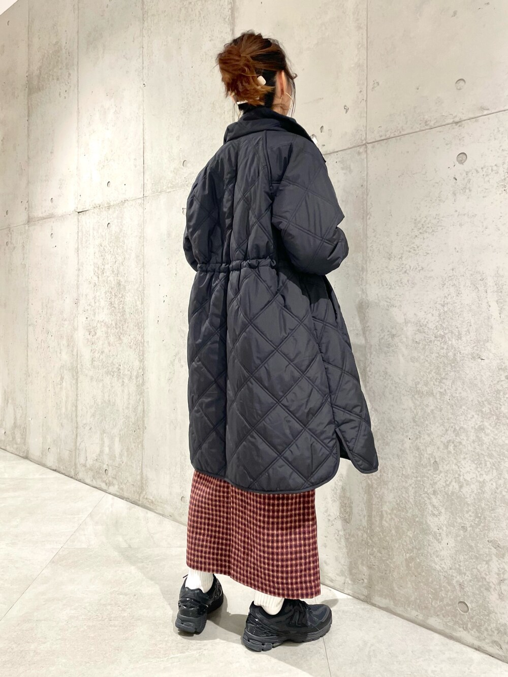 ロングコートは中綿で軽く、ウエストドローコードでレディライクに着られますよ。