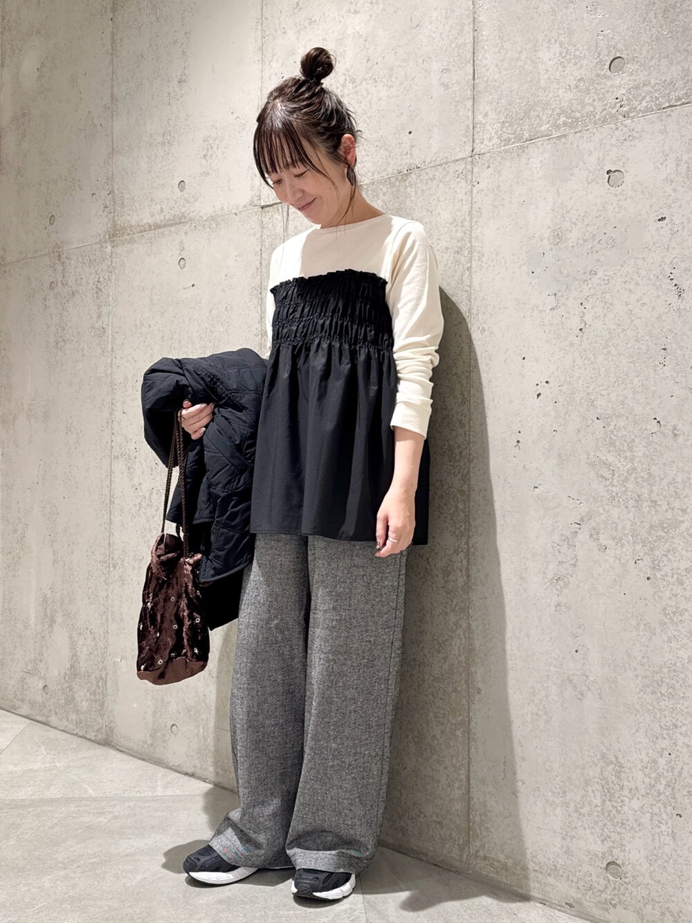 ボトムスは、ツイードパンツで、落ち着いたモノトーンスタイルにまとめてみました。