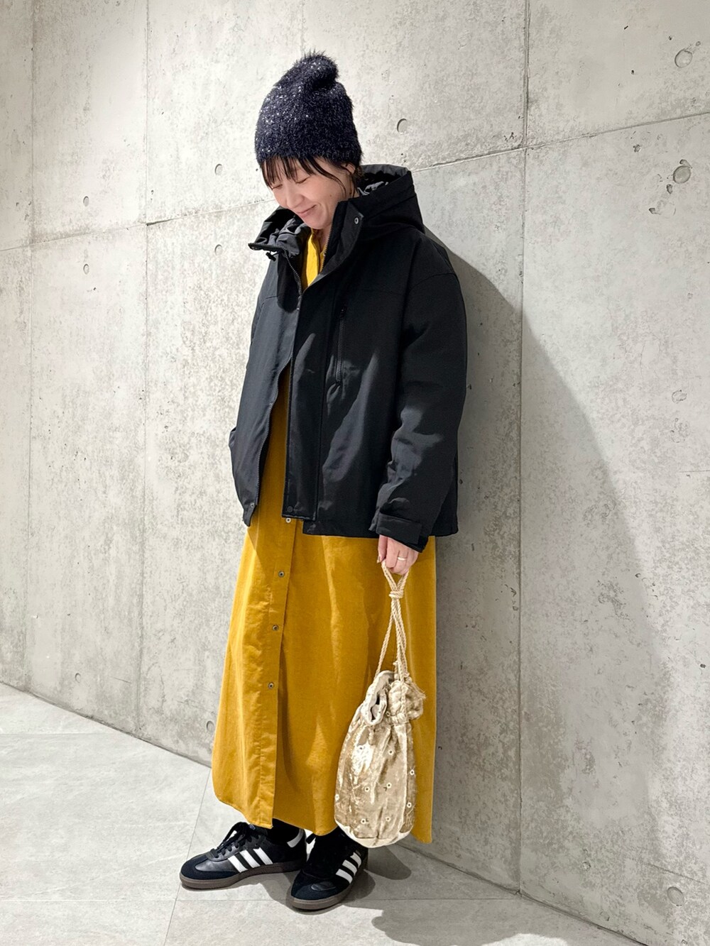 マスタードカラーがアクセントになり、暗くなりがちな秋冬スタイルが華やかになります。