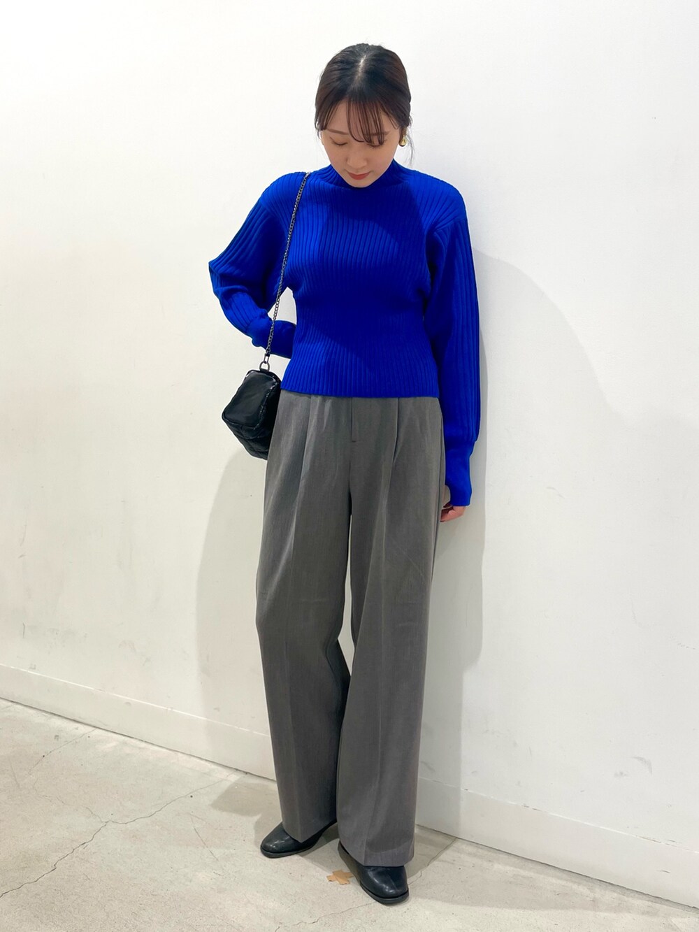 鮮やかなブルーのトップスは腕や胸周りは緩め、ウエスト周りは少しタイトめなシルエットになっているので自然とウエストマークされて、とってもスタイルが良くみえます♪