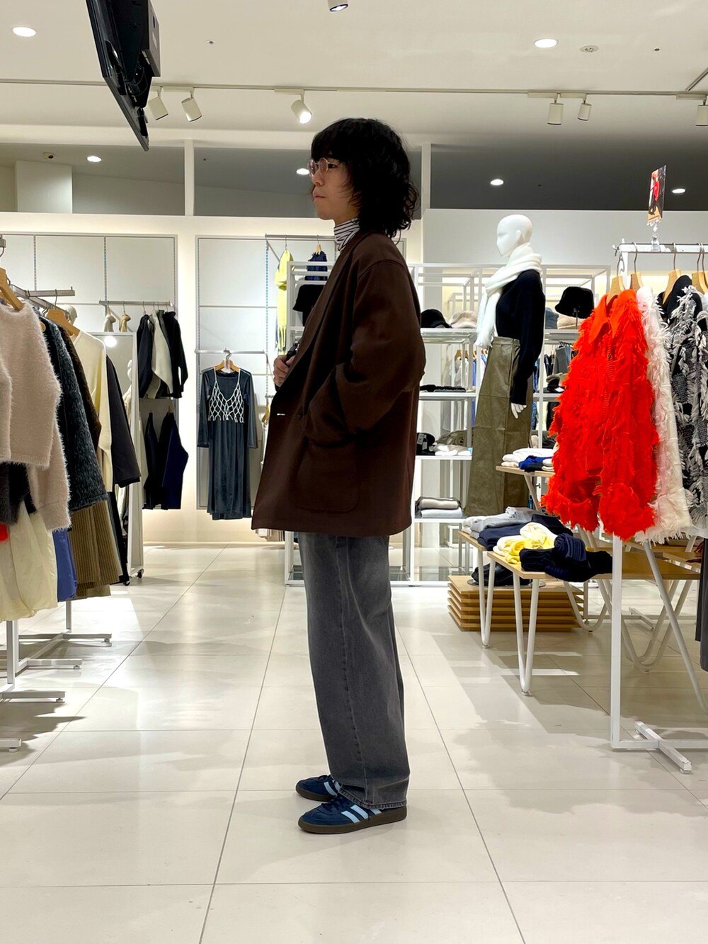 ヘリンボーンのブラウンジャケットに淡いブルーのニットを合わせ、首元にボーダー柄を差し込んだコーデ