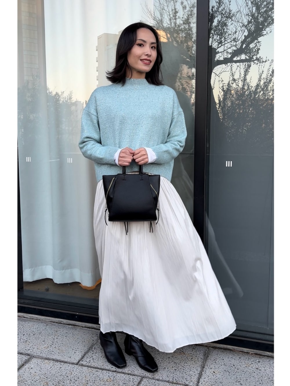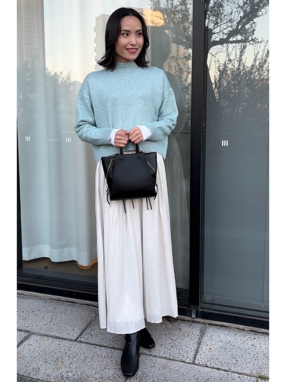 ニットはややショート丈なのでどのボトムスとも相性抜群!縦のラインをすっきり見せてくれます。