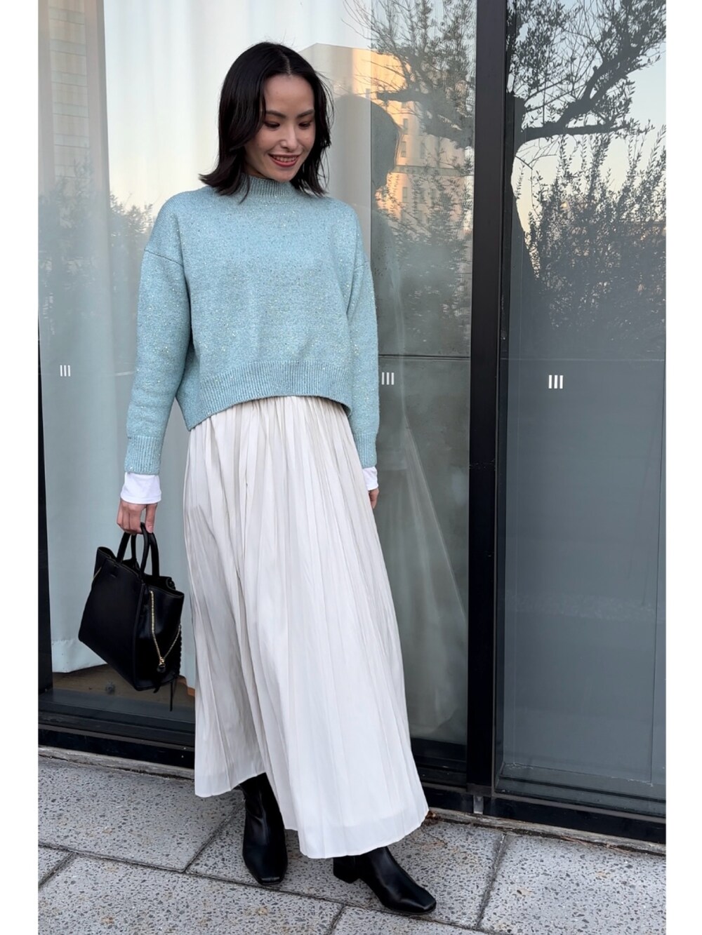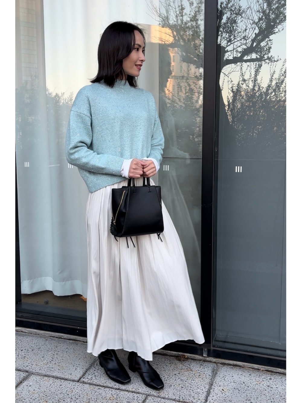 スパンコールニットとプリーツスカートを合わせて華やかで品のあるコーデに◎