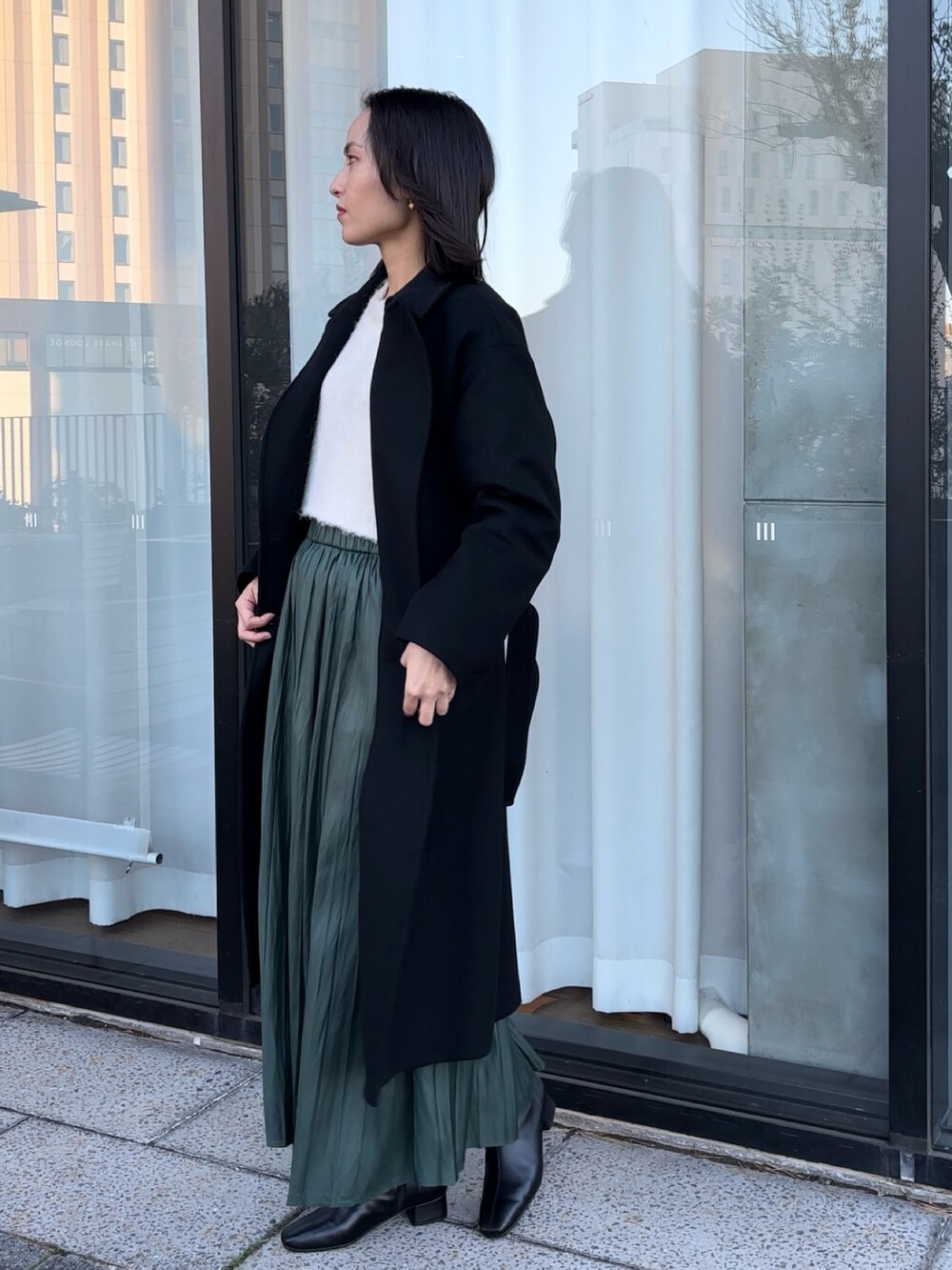 シャギーニットのふんわりとした質感を雪に見立てて、光沢感のあるグリーンのスカートでクリスマスツリーを意識してみました🤭♡