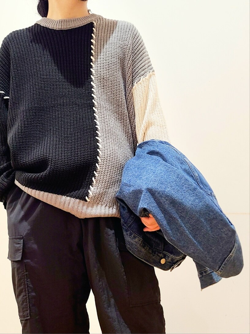 ボディーは3色で切替えており、切替え箇所をブランケットステッチでアクセントにした一枚でもサマになるニットです。