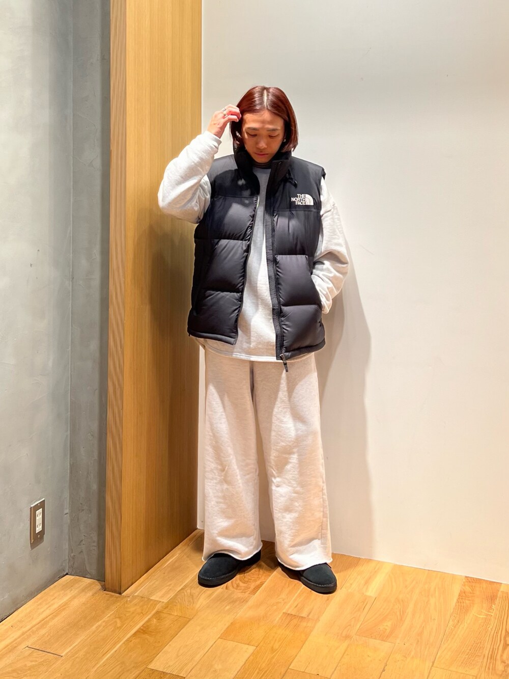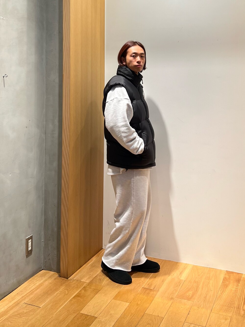 ダウンベスト×スウェットセットアップのラフなコーディネートをデザートブーツ合わせで大人な印象に✨