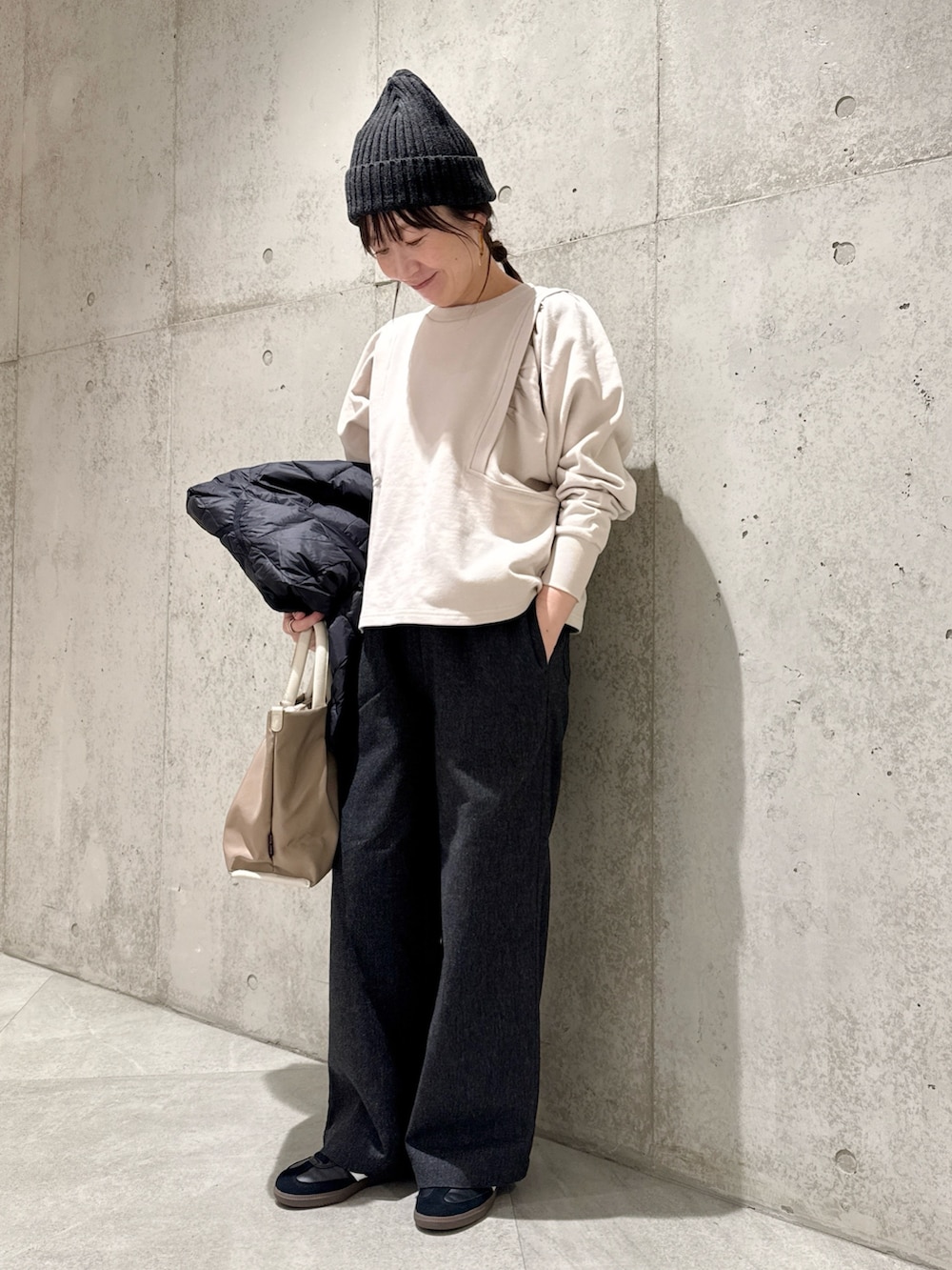 今回は、ツイードパンツを合わせて、モノトーンでまとめた大人カジュアルコーディネートです。