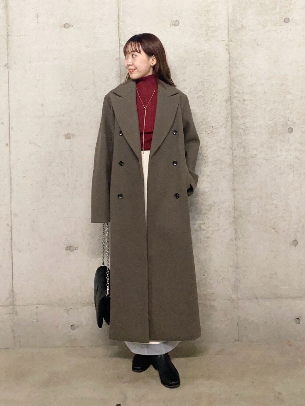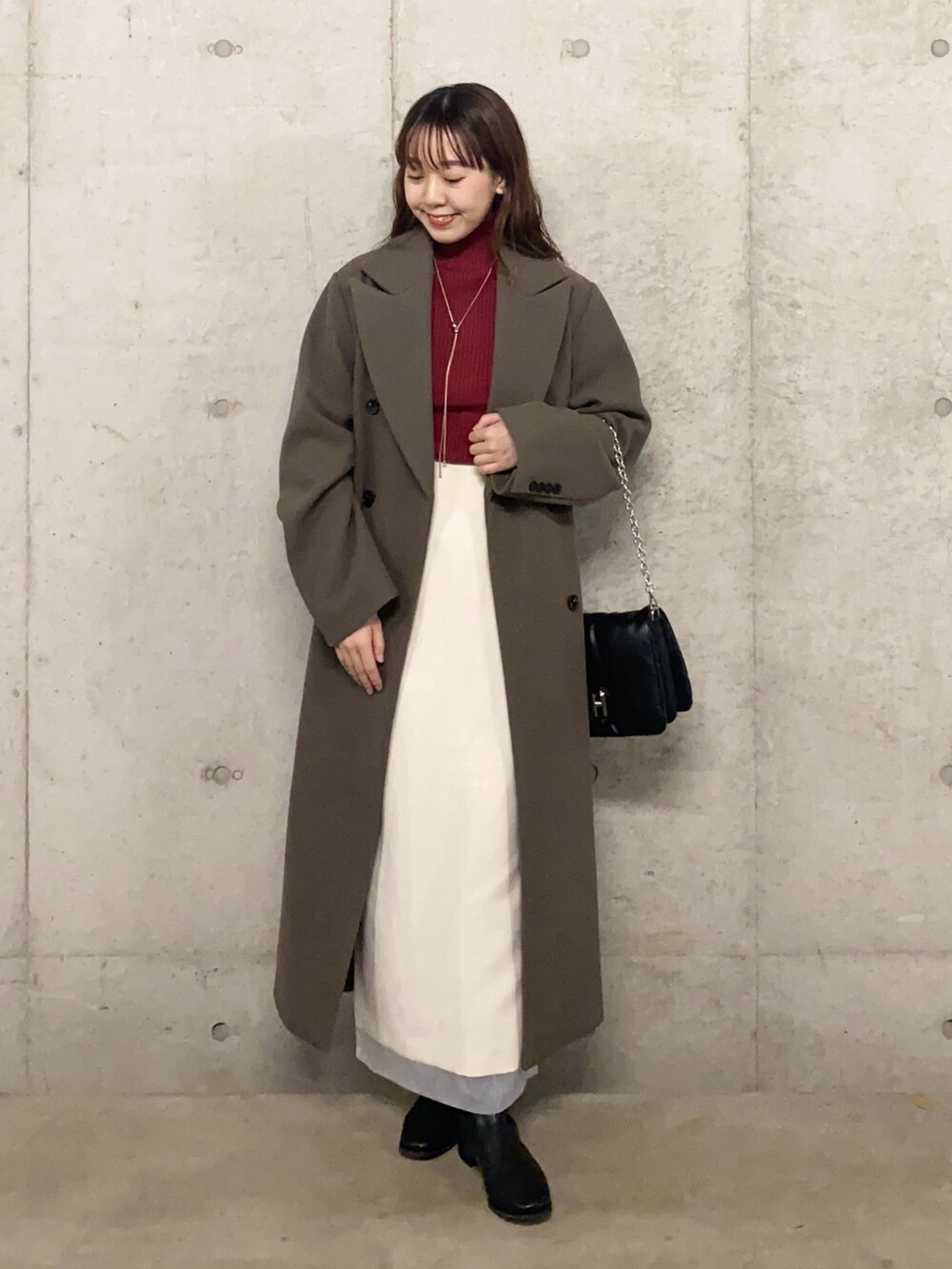 くすみレッドを取り入れて、ダブルコートとオーガンジーのスカートで上品さアップ😍⤴️