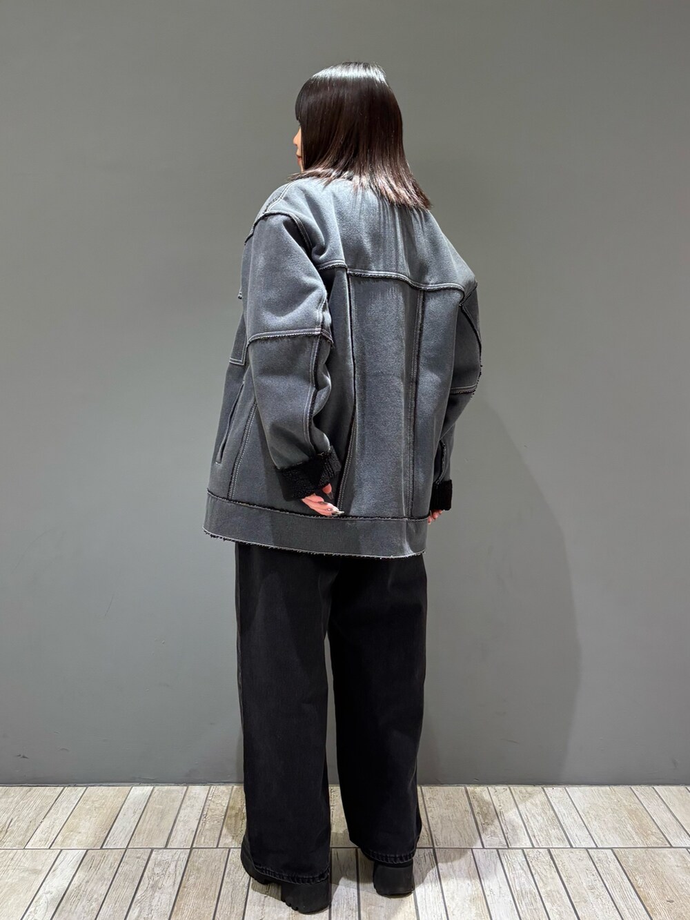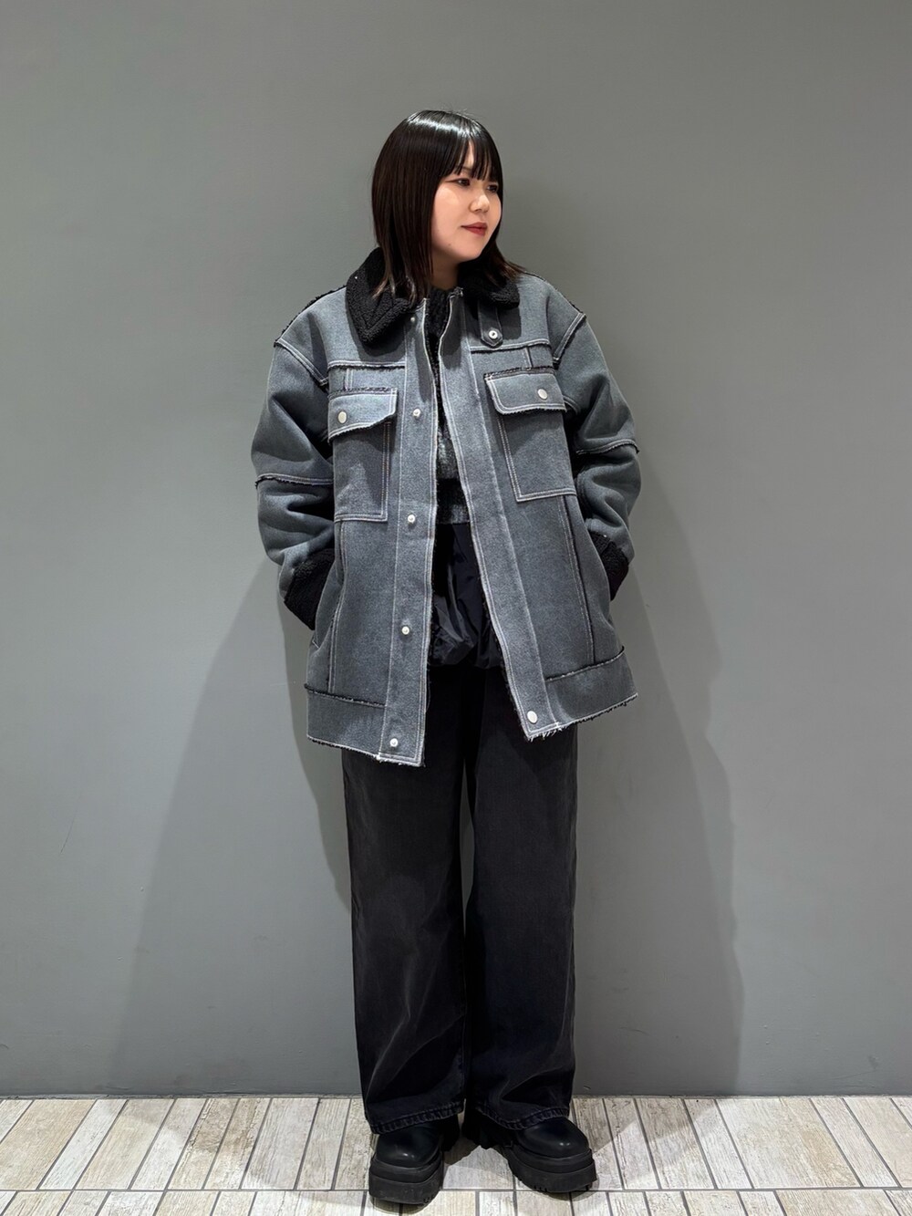 デニム/フェイクレザー/ツイルの3素材がカラーごとに楽しめる冬本番アウターです!!中に着込んでもゆとりのあるサイズ感と、ハイネックにもなるデザインでこの冬活躍すること間違いなし🌟おしりがすっぽり隠れる丈感も個人的嬉しいポイントです🥹