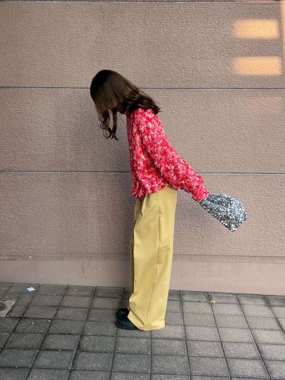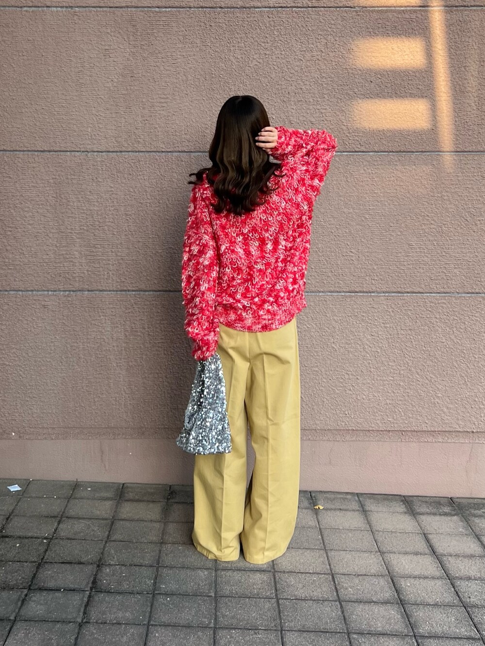 トップスは赤ニットでミックス編みになっていて派手すぎないのでとても着やすいアイテムです!ゆったりと着ることが出来る可愛いニットになっています!
