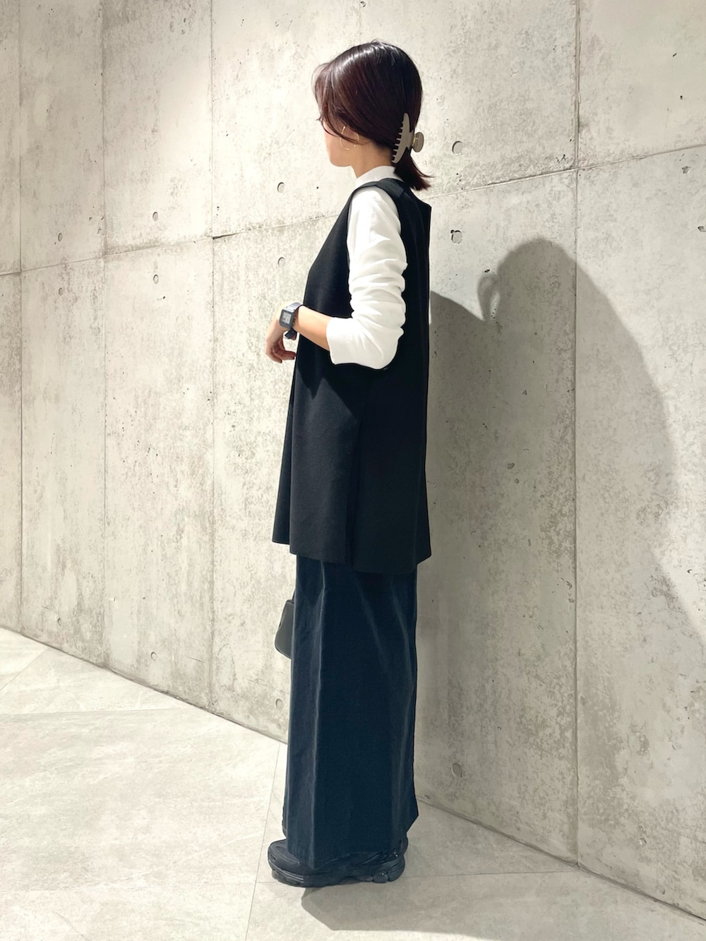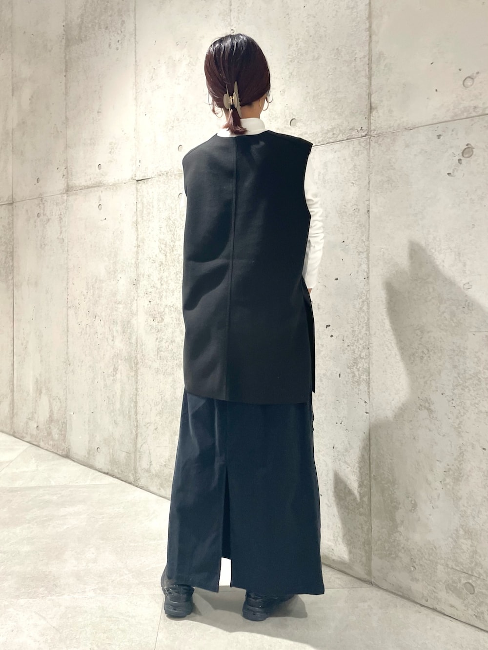 WEB限定のメルトンベストは、オーバーサイズですが柔らかい素材なので、Iラインスカートと合わせてもスッキリ着られて◎