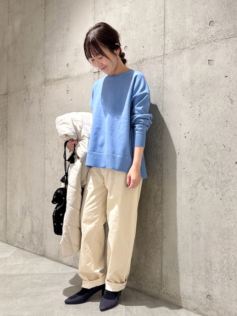 今回は、ホワイトコーデに、ブルーのニットを差し色にしてみました。