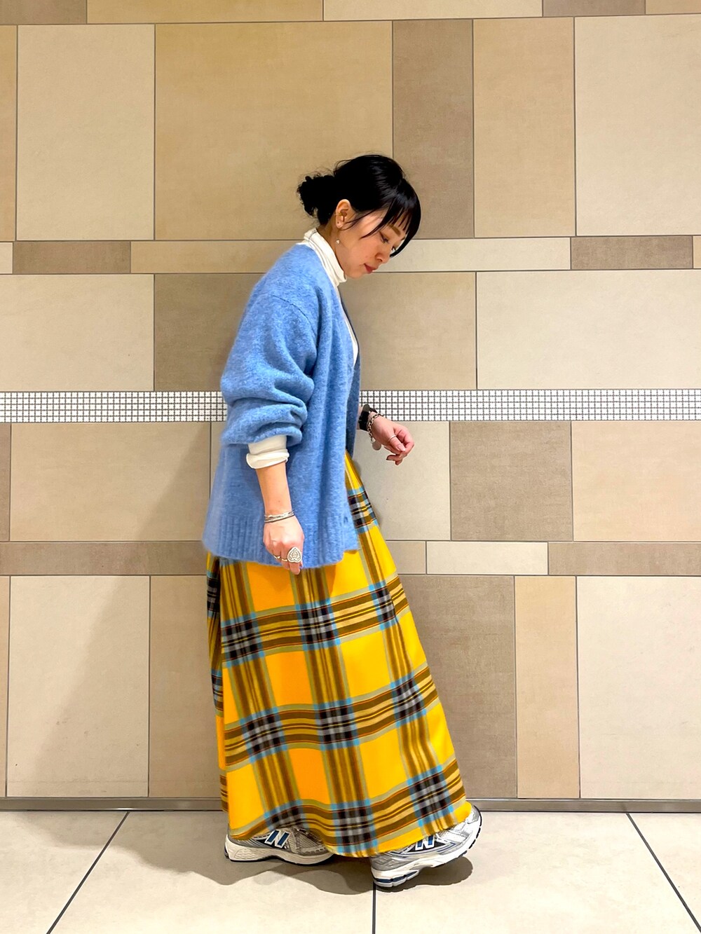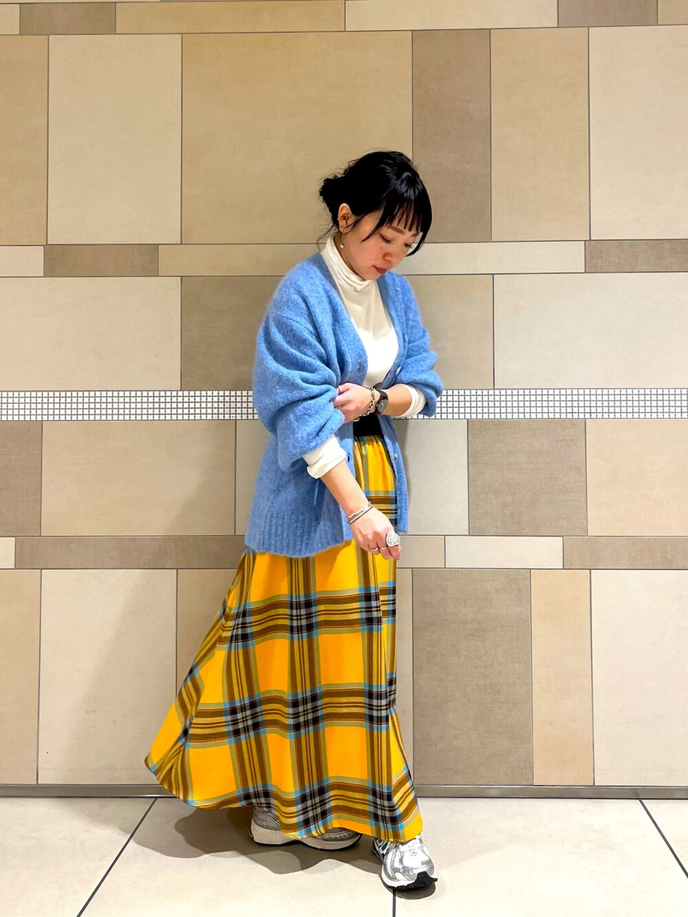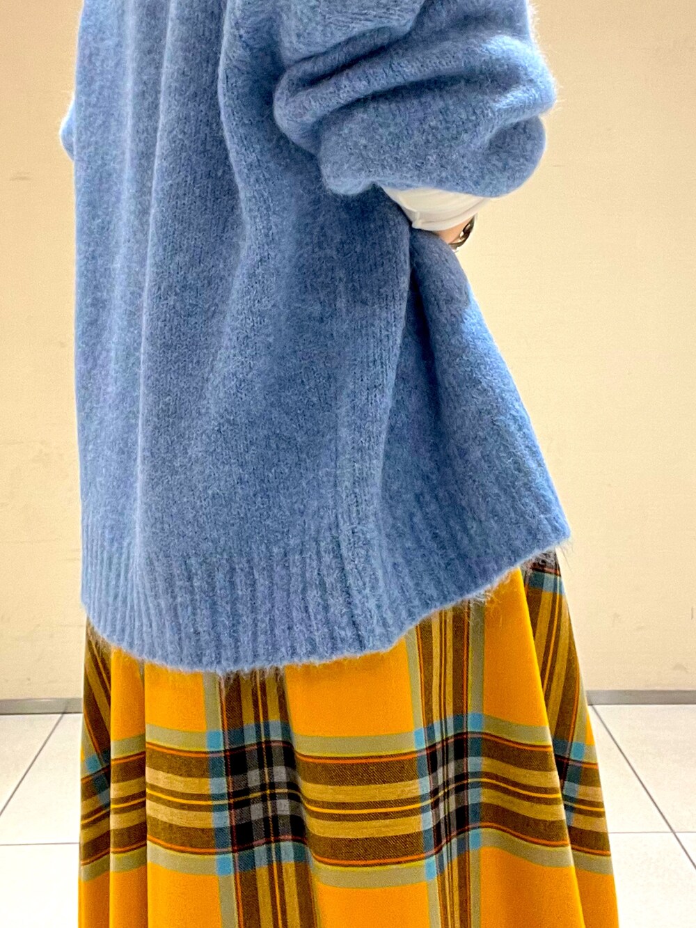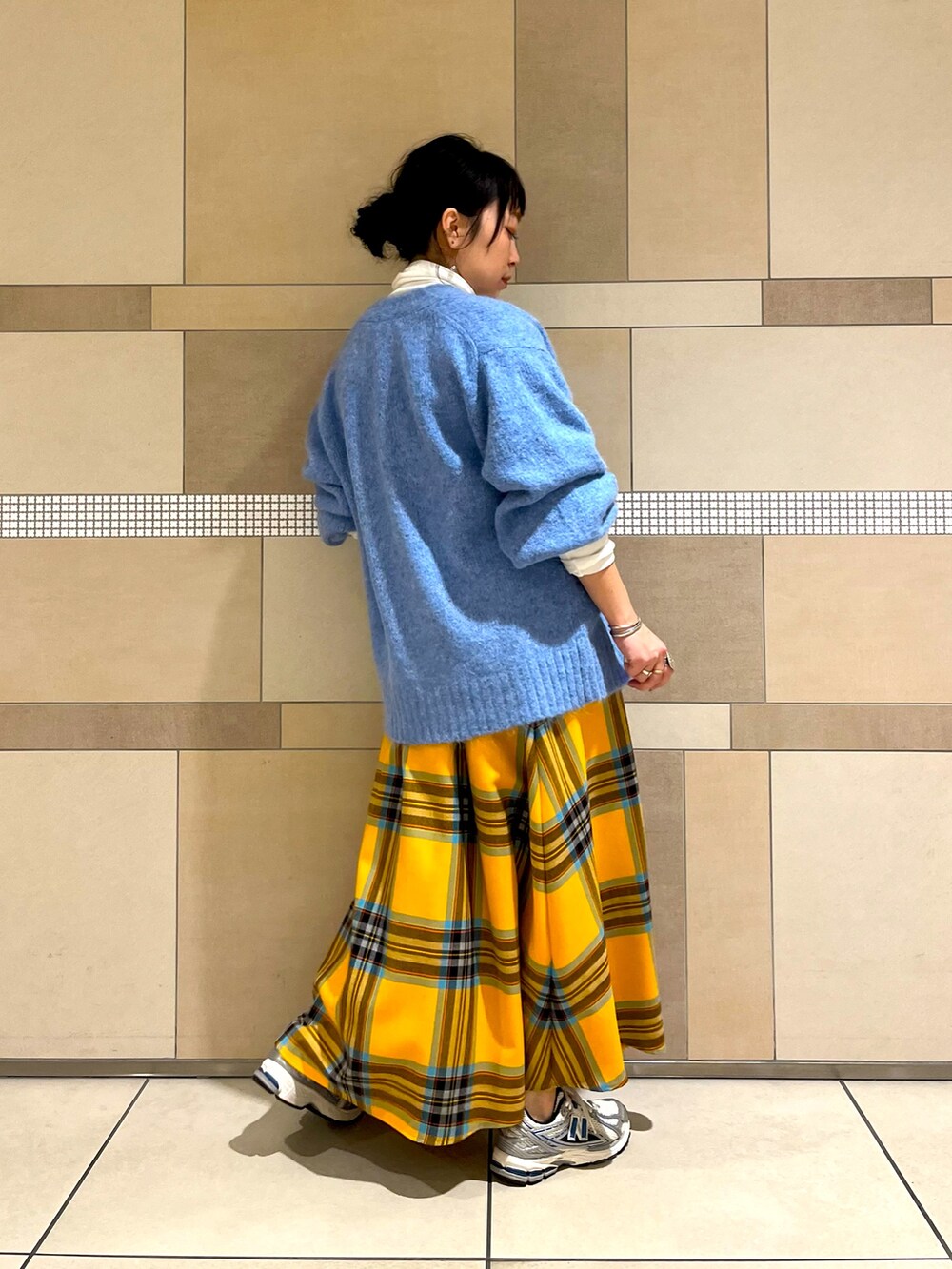 アルパカのカーディガンは、シルエットはベーシックなので、何と合わせてもバランス良く羽織れて可愛い!