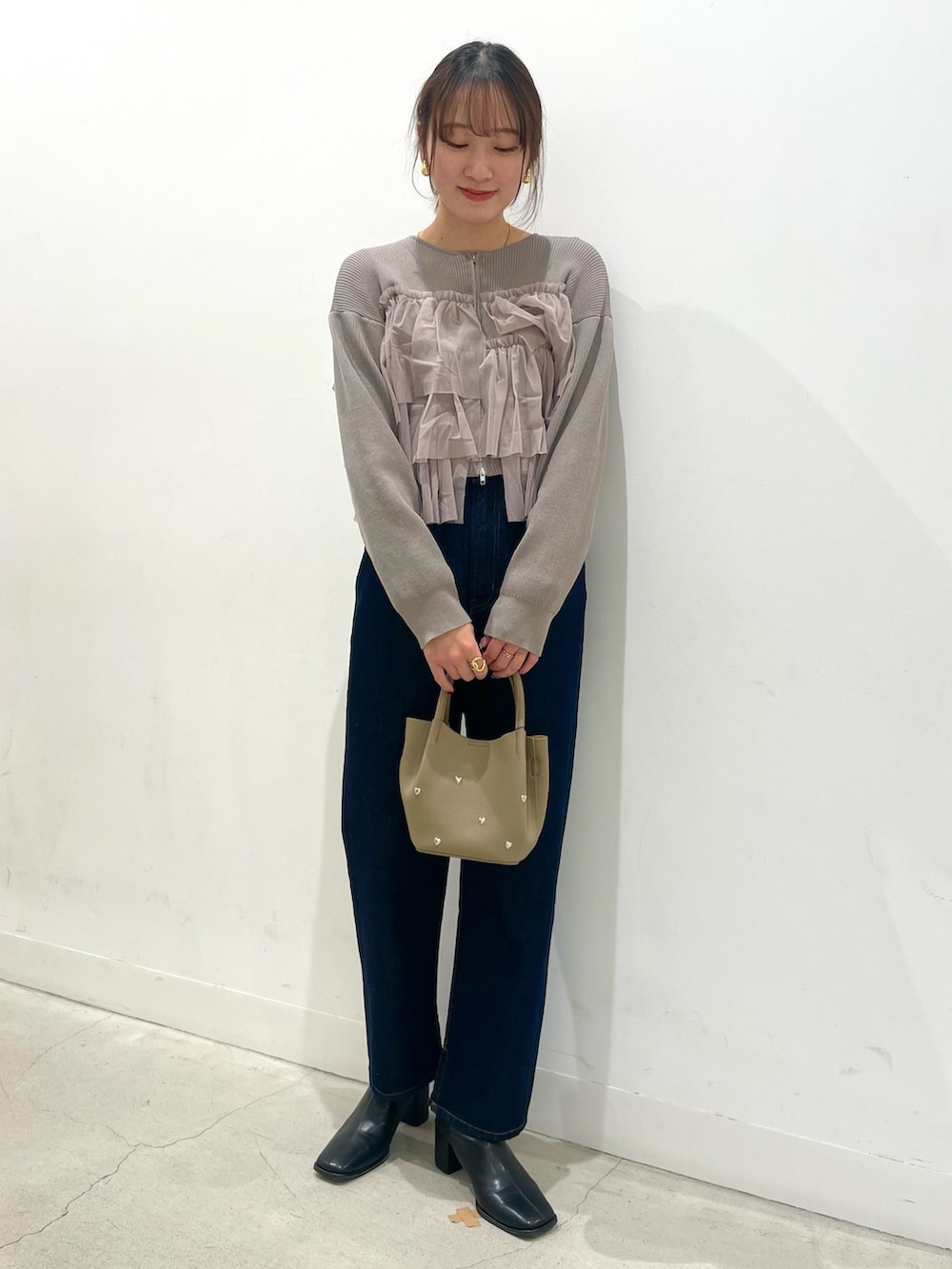 カジュアルなアイテムが多くなったので、トップスはフリルが可愛いニットカーデを選びました♪