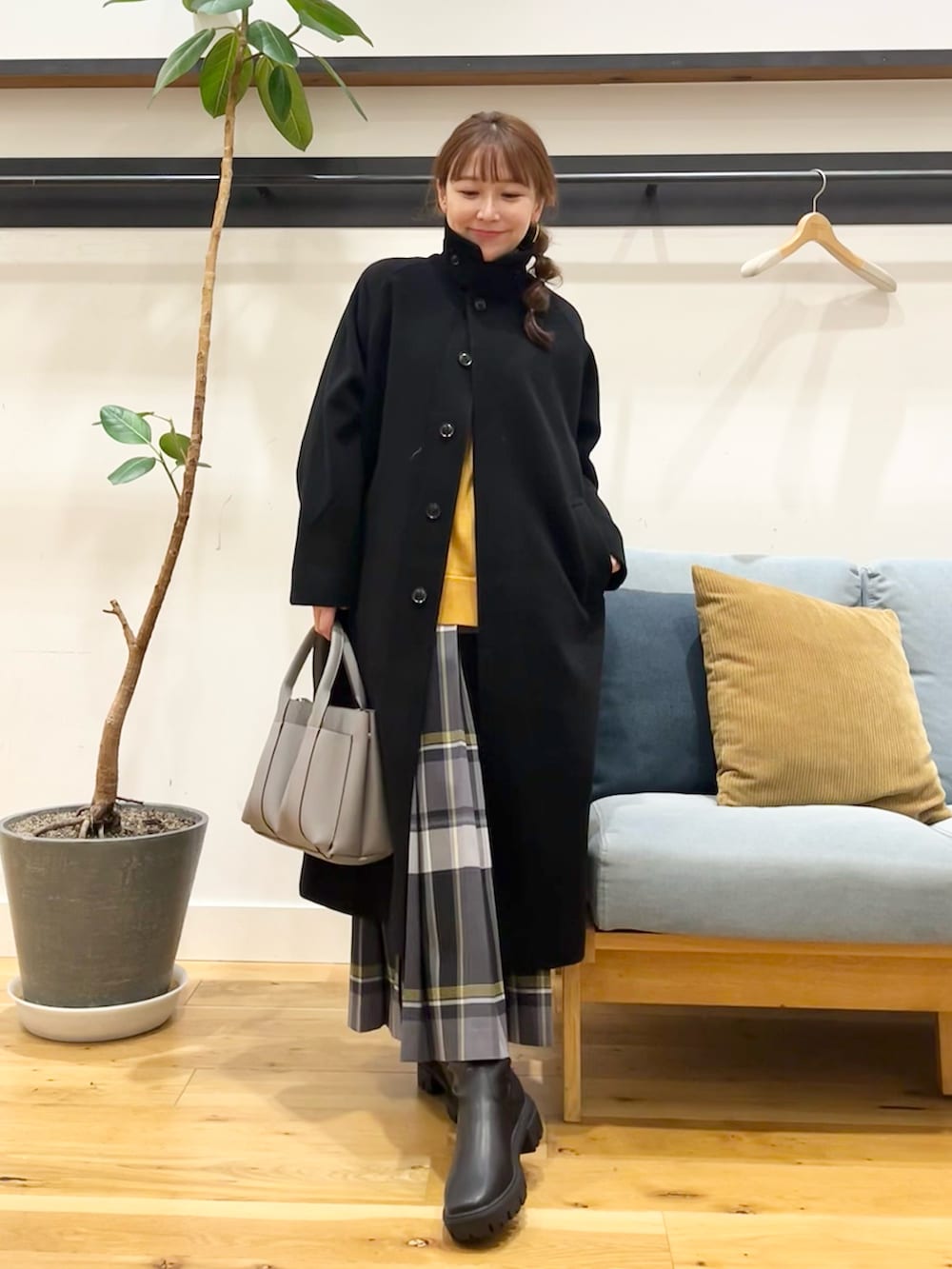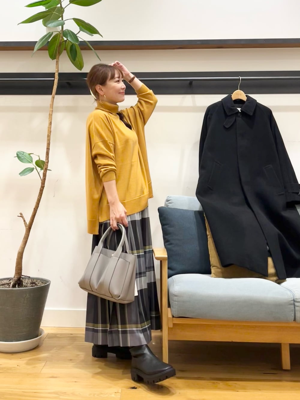 アウターにはウール100バルマカーンコートを着ています。