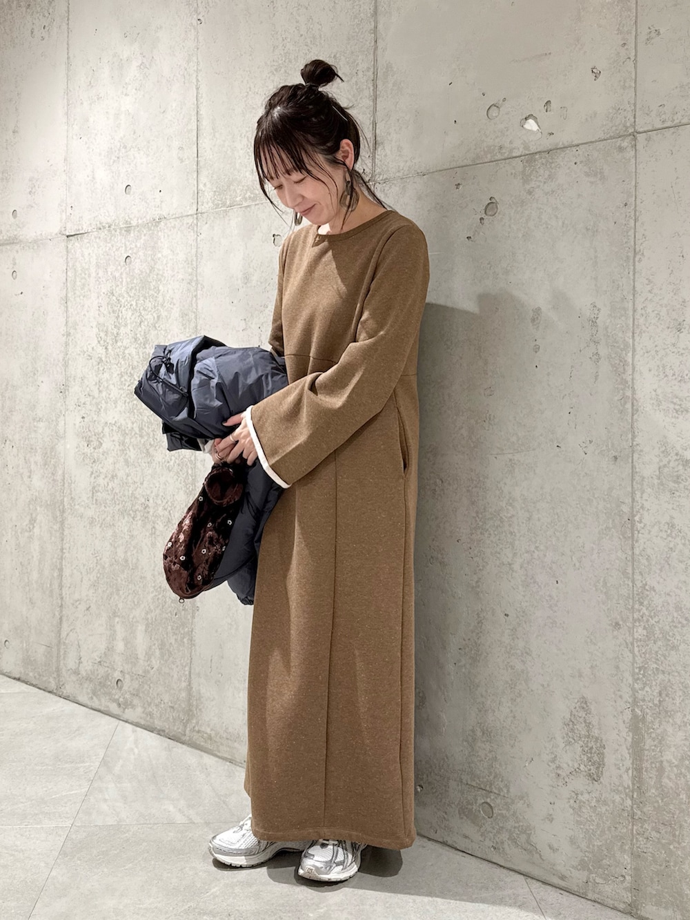 ワンピースは、スウェット素材なので、着心地が良く、袖の切りっぱなしがポイント。