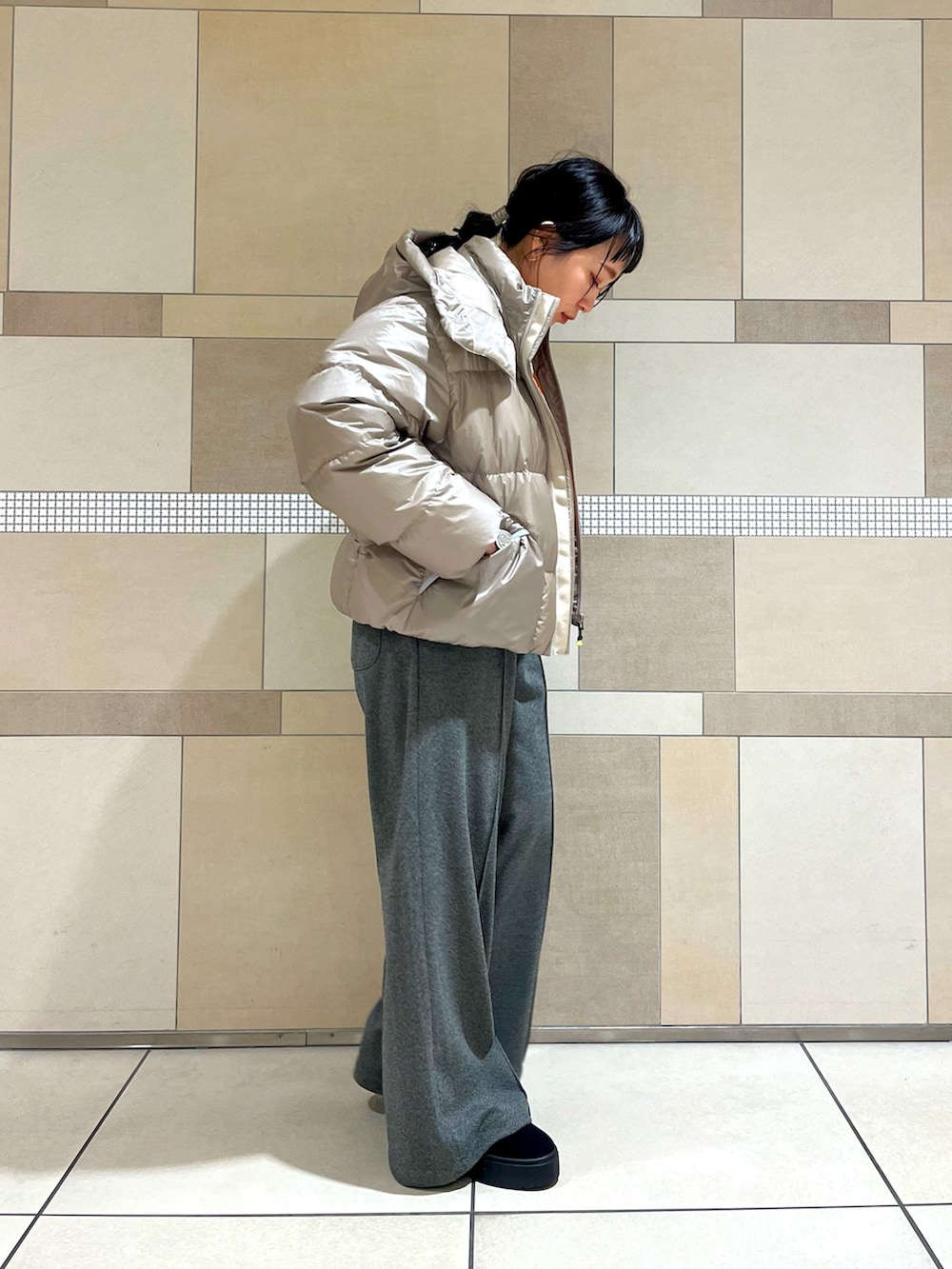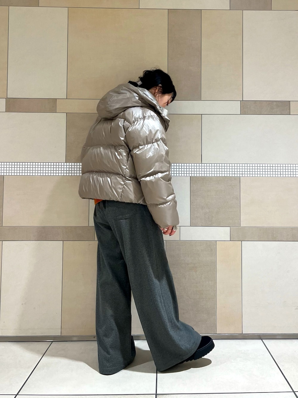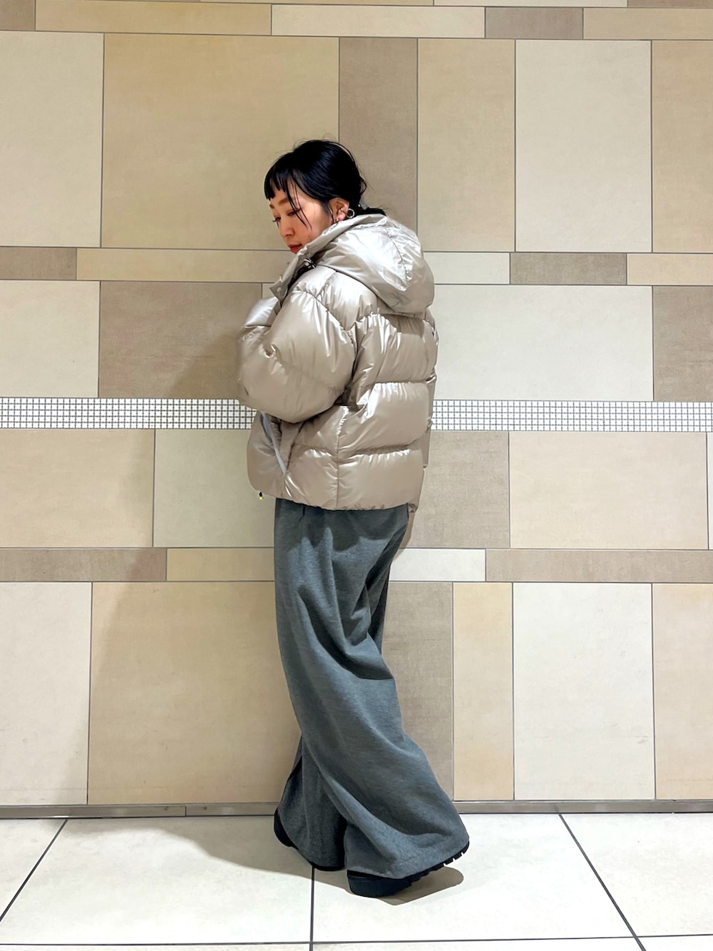 艶感のある生地は、ダウンジャケットのカジュアル感を抑えキレイ目なスタイルにも取り入れやすく。