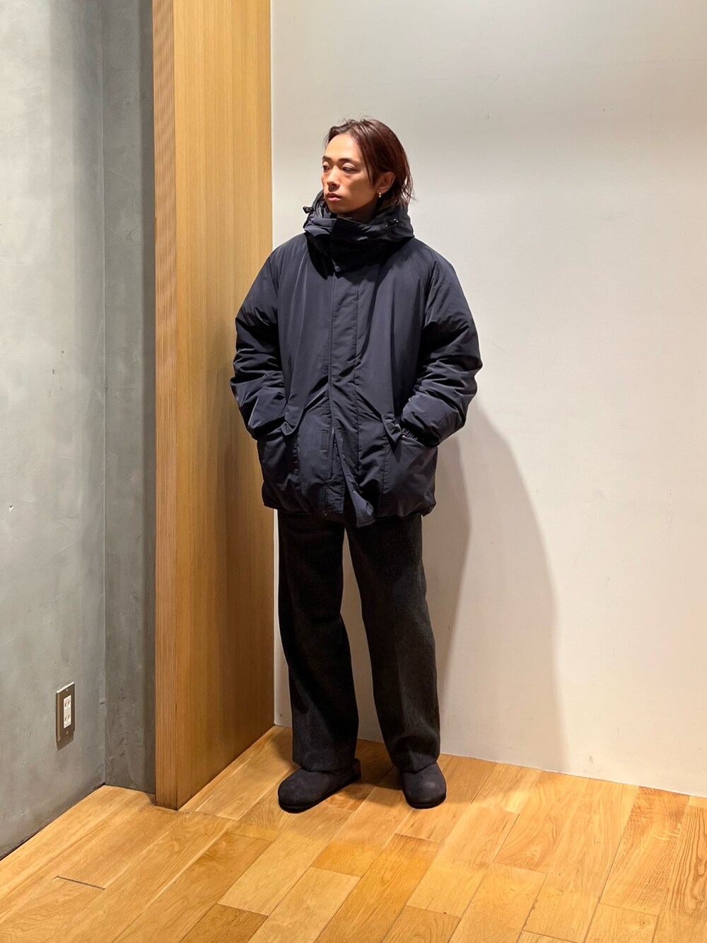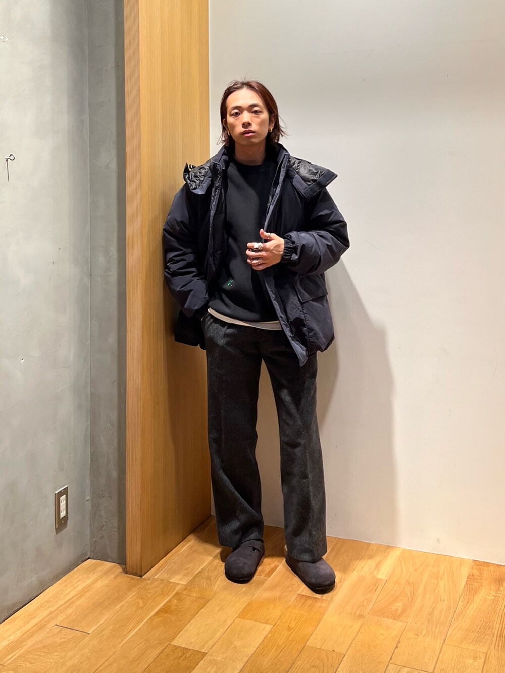 テックなダウンジャケットとワイドスラックスの合わせが👍