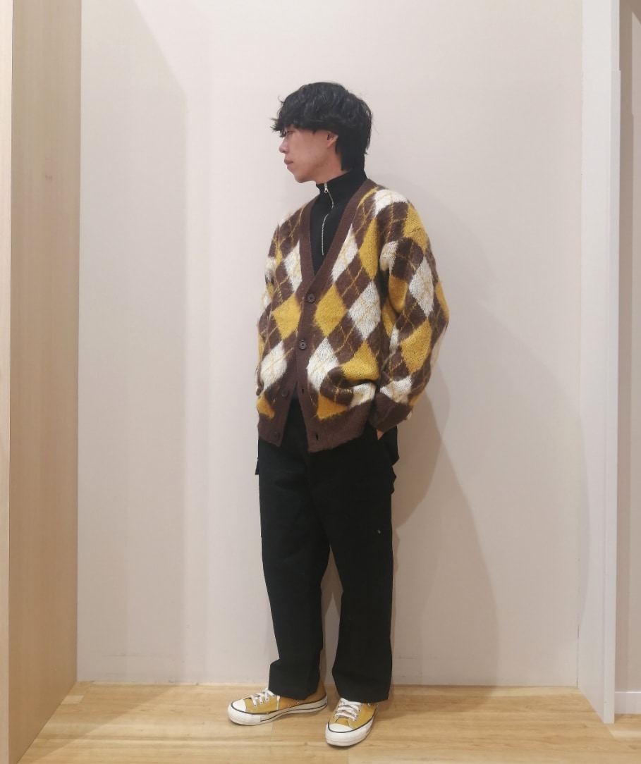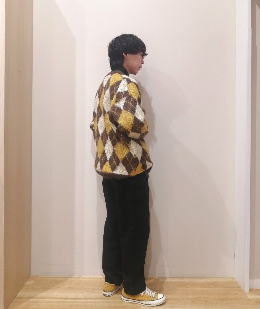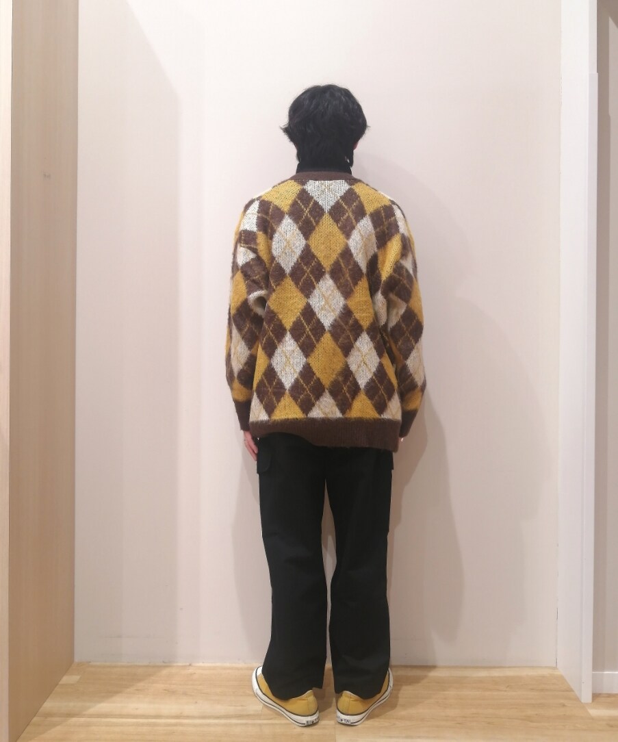 目を惹くアーガイル柄カーディガンがメインのコーデになります。