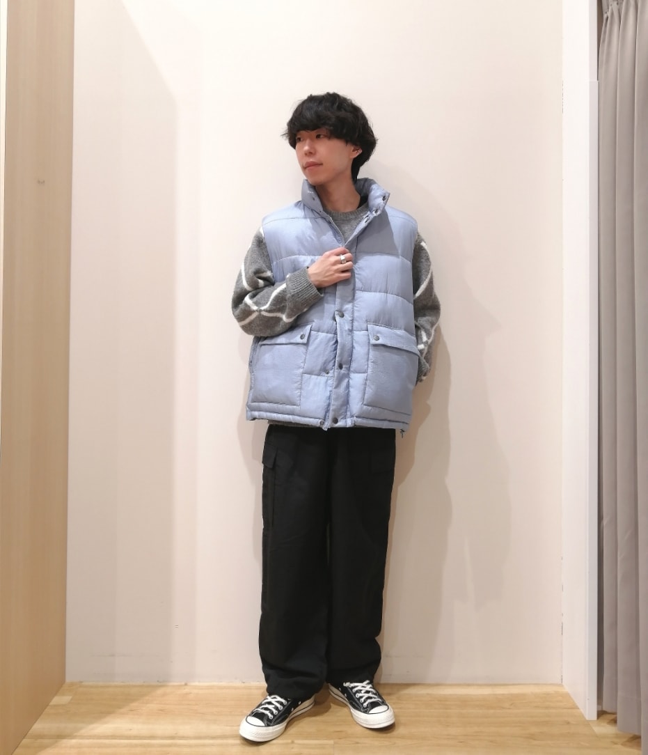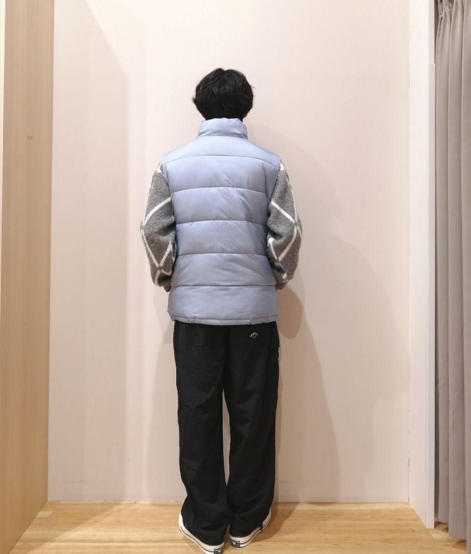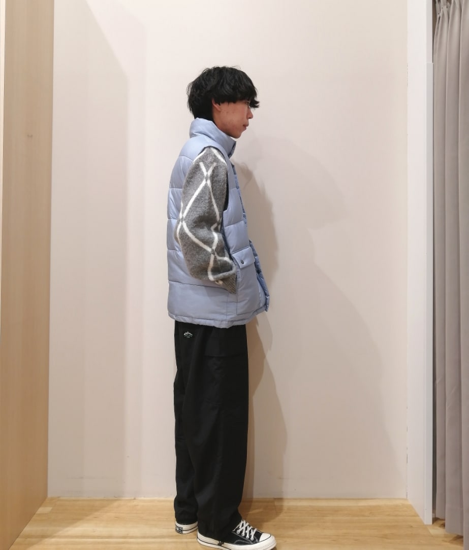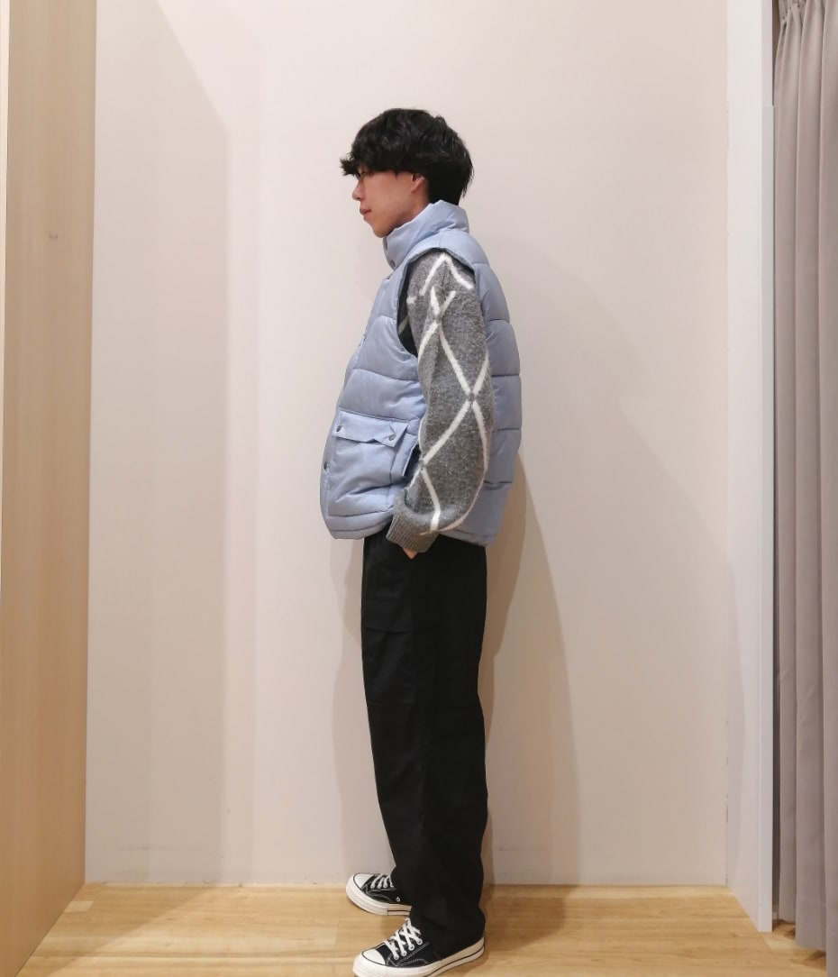 発色の良いベストが目を惹くカジュアルスタイルになります。