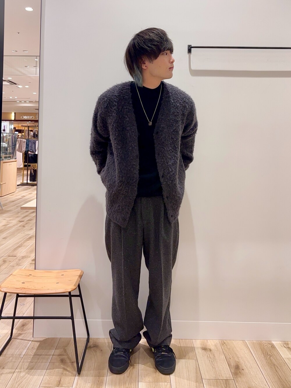 ヘアリーニットカーディガンにウールブレンドのワンタックパンツを使ってモノトーンコーデ🐼