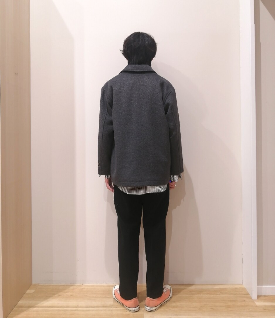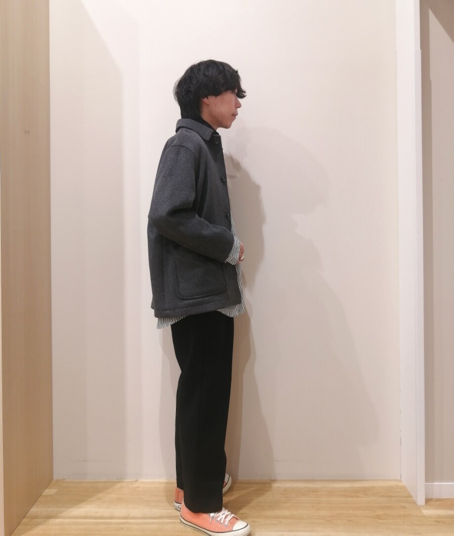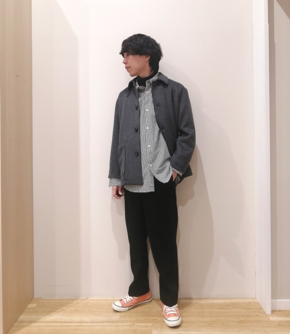 コート×シャツ×タートルネックのレイヤードスタイルになります。