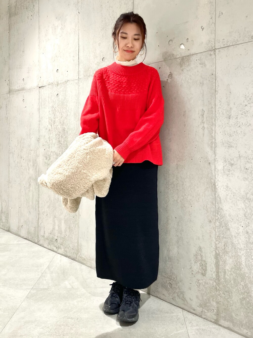 パキッと赤の求心ニットに、上品なラメのスカートを合わせてボアジャケットをON。