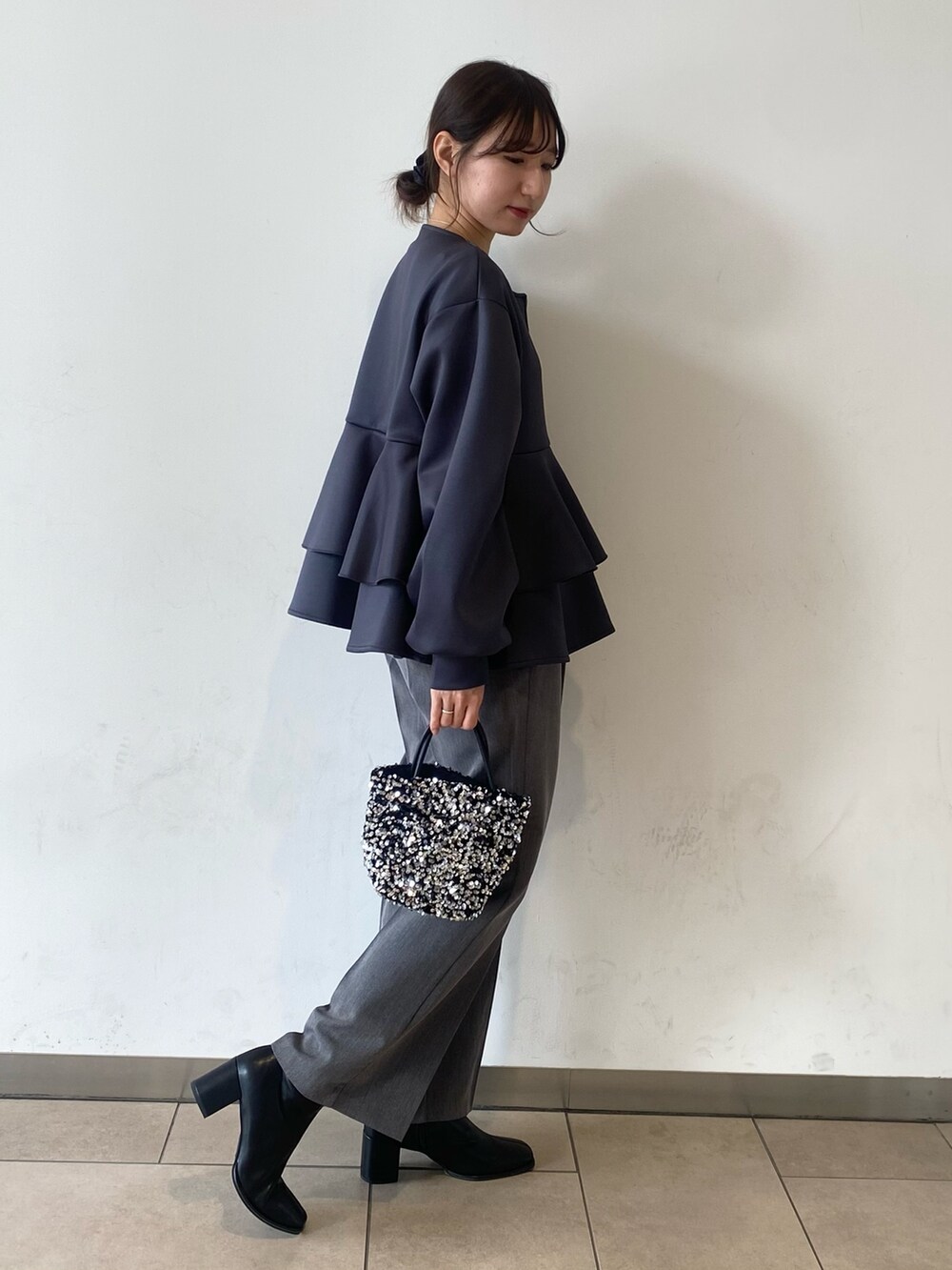 ペプラムなのでボトムスはストレートパンツですっきりと◎