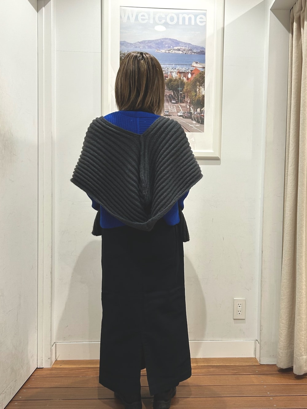 フードリブマフラーを、巻くだけでオシャレなコーデになるのでオススメです!