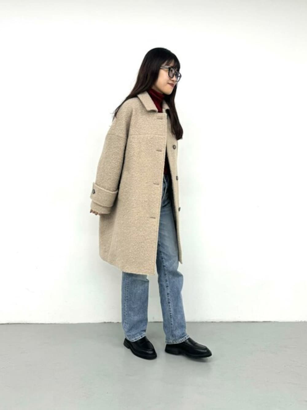 ブークレ素材が暖かな表面感の、ステンカラーコートを着用しました♪