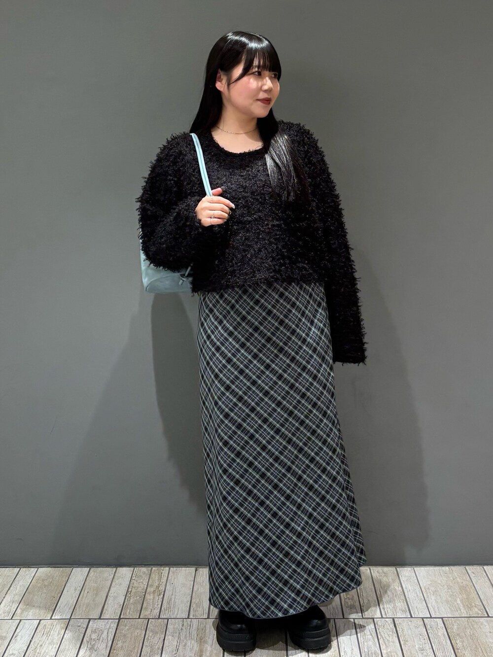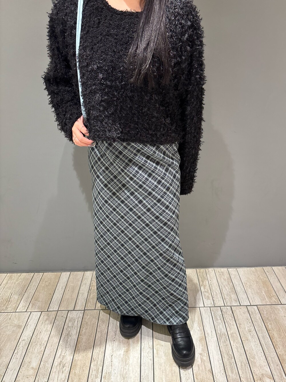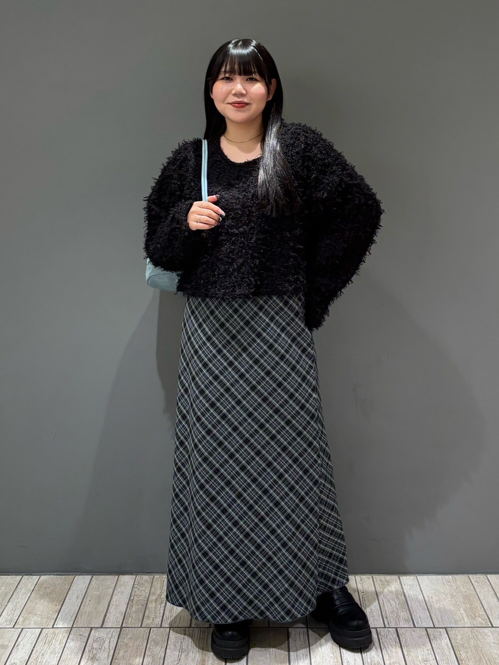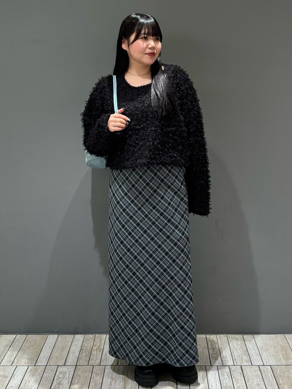 今回は、ブラック×ブルーの大人っぽキレイめコーデを組んでみました!チェックナロースカートはスタイルアップでおすすめです👀