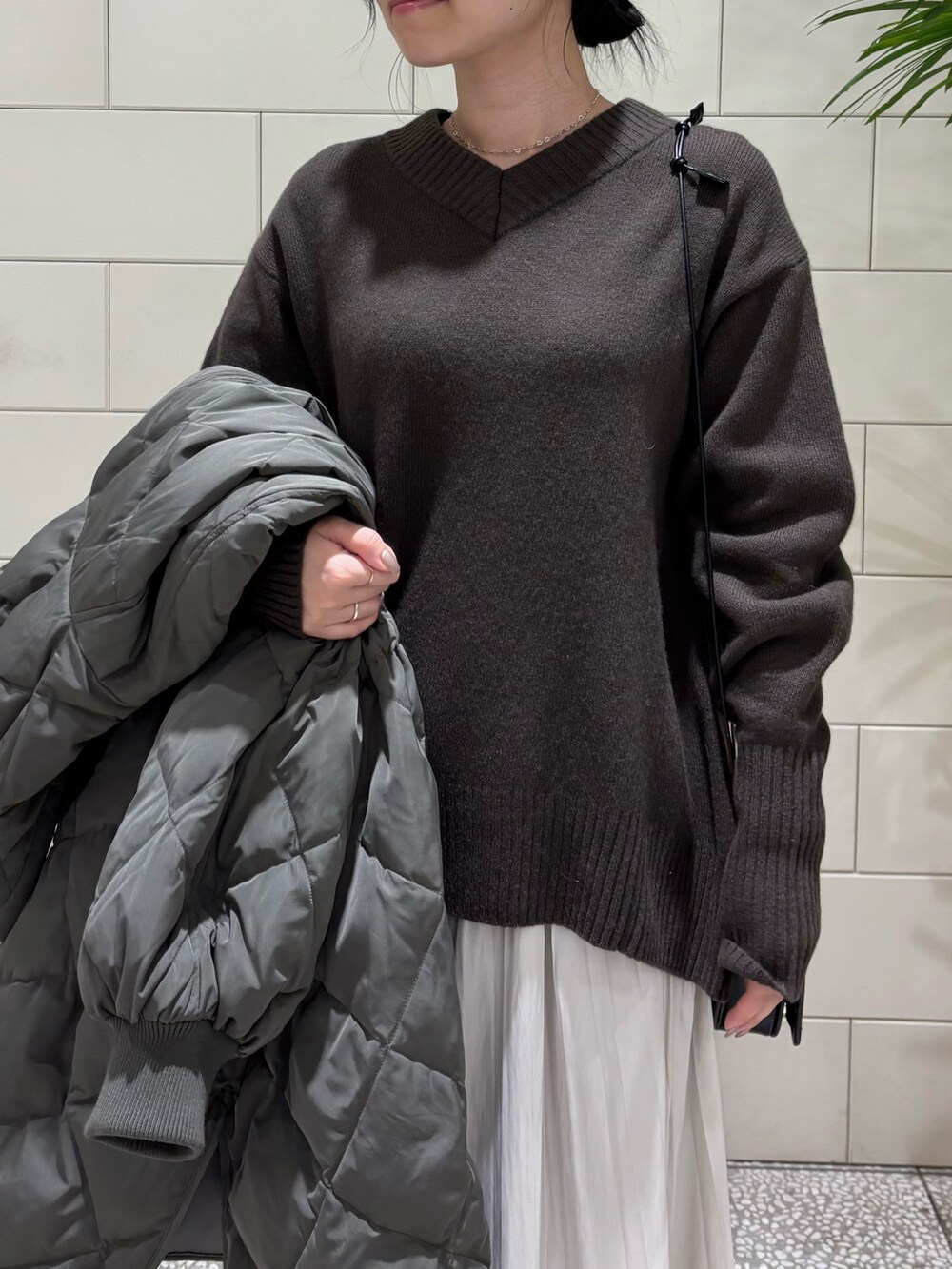 全体的にゆったりとしたシルエットに袖部分のリブで全体にメリハリの出るニットです。首元のデザインが可愛いです。