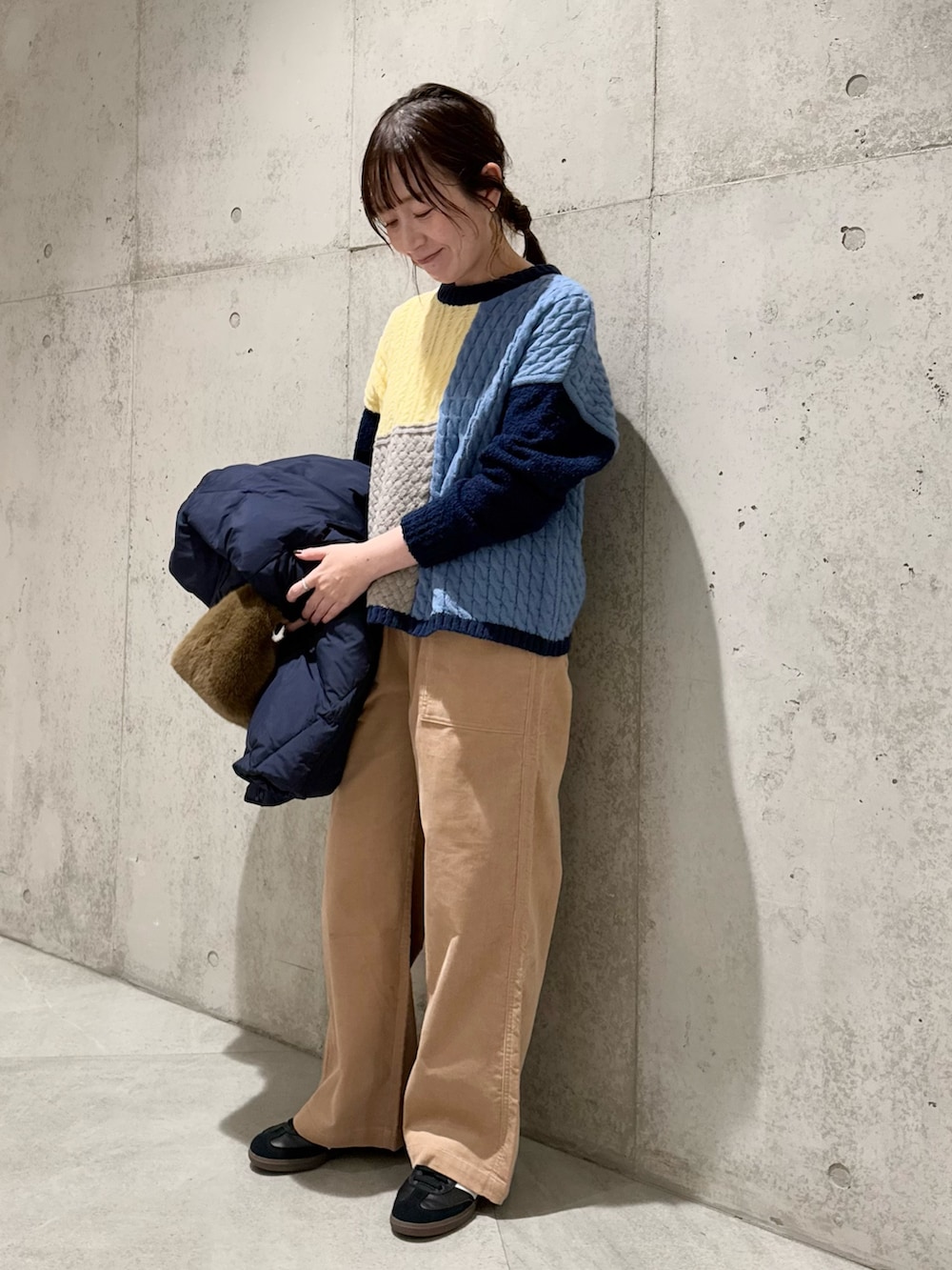 今回は、パッチワーク柄がアクセントになったニットを合わせたコーディネートです。