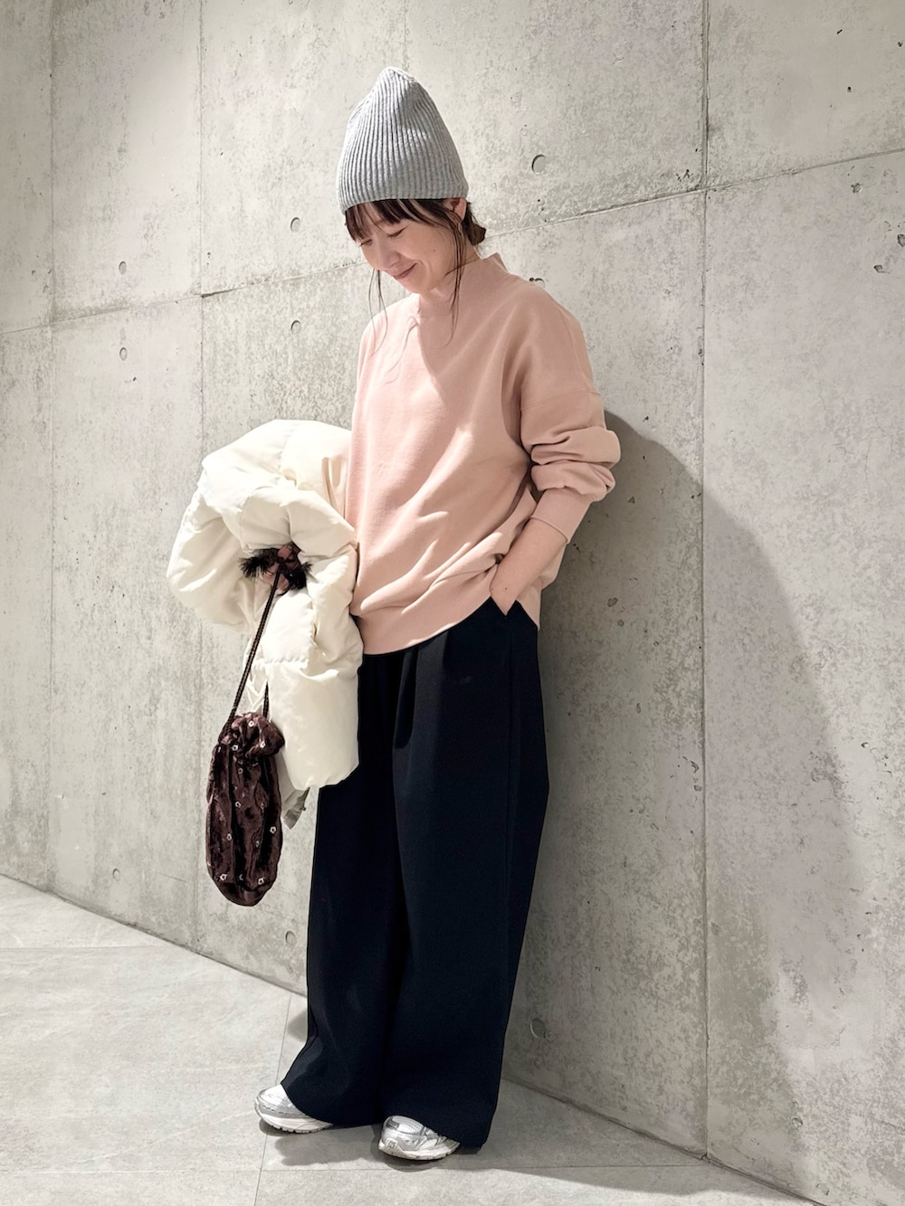 今回は、ピンクカラーのスウェットを差し色にした、大人カジュアルコーディネート。
