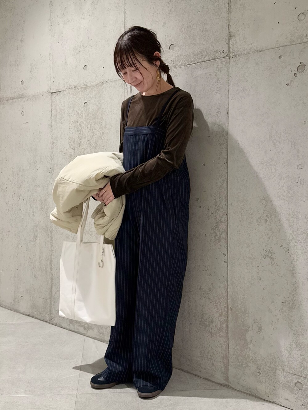 光沢感が大人な印象の、ベロアトップスとレイヤードスタイルです。
