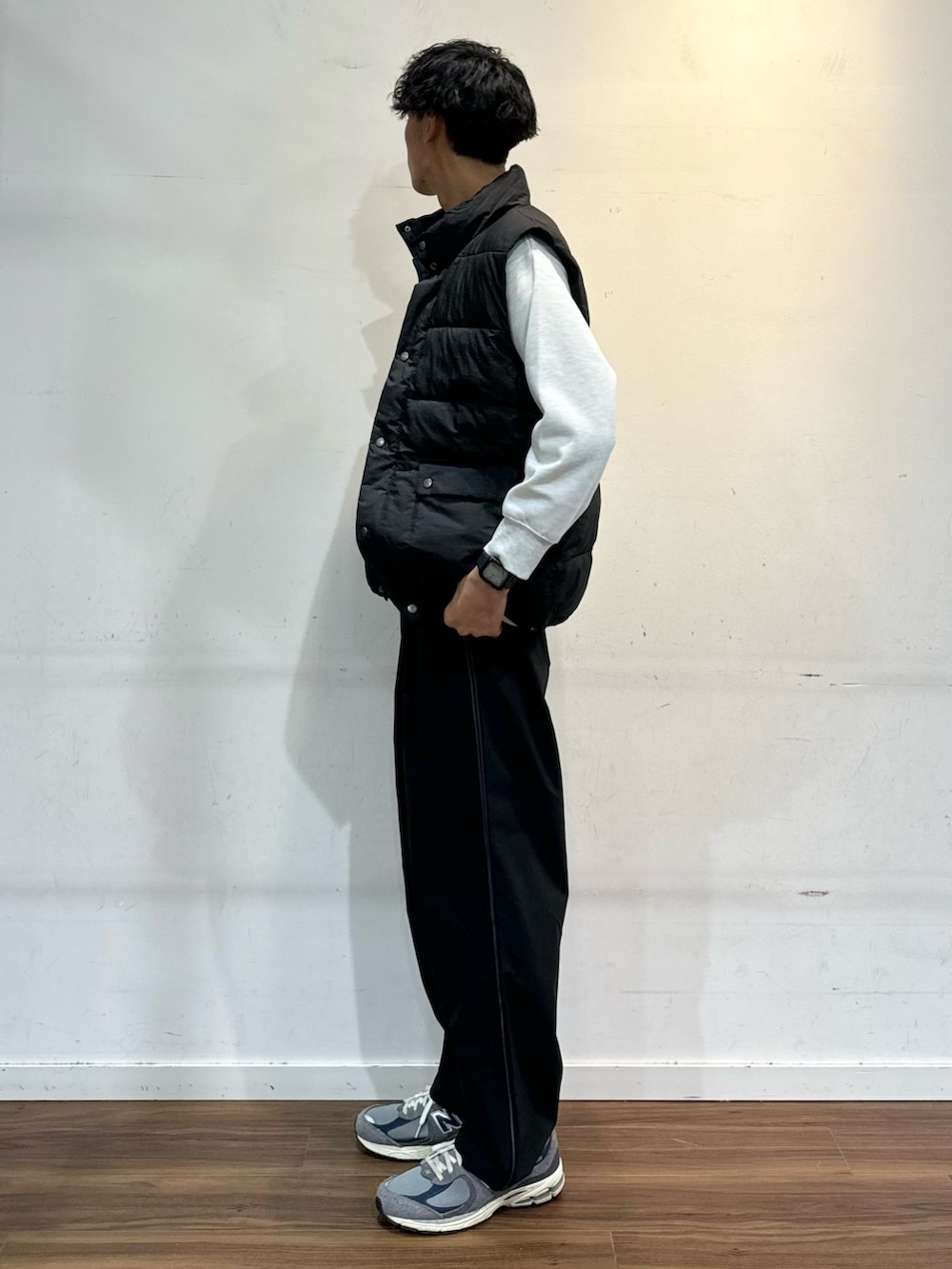 スウェット×ベストは定番のカジュアルスタイル。パンツはトラックパンツで合わせてさらにカジュアルさを。