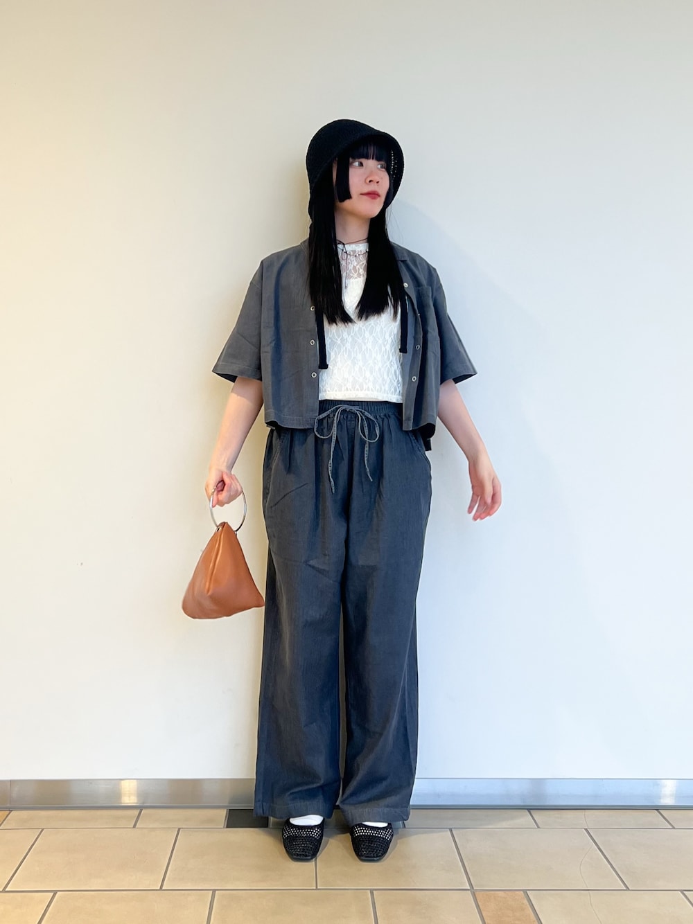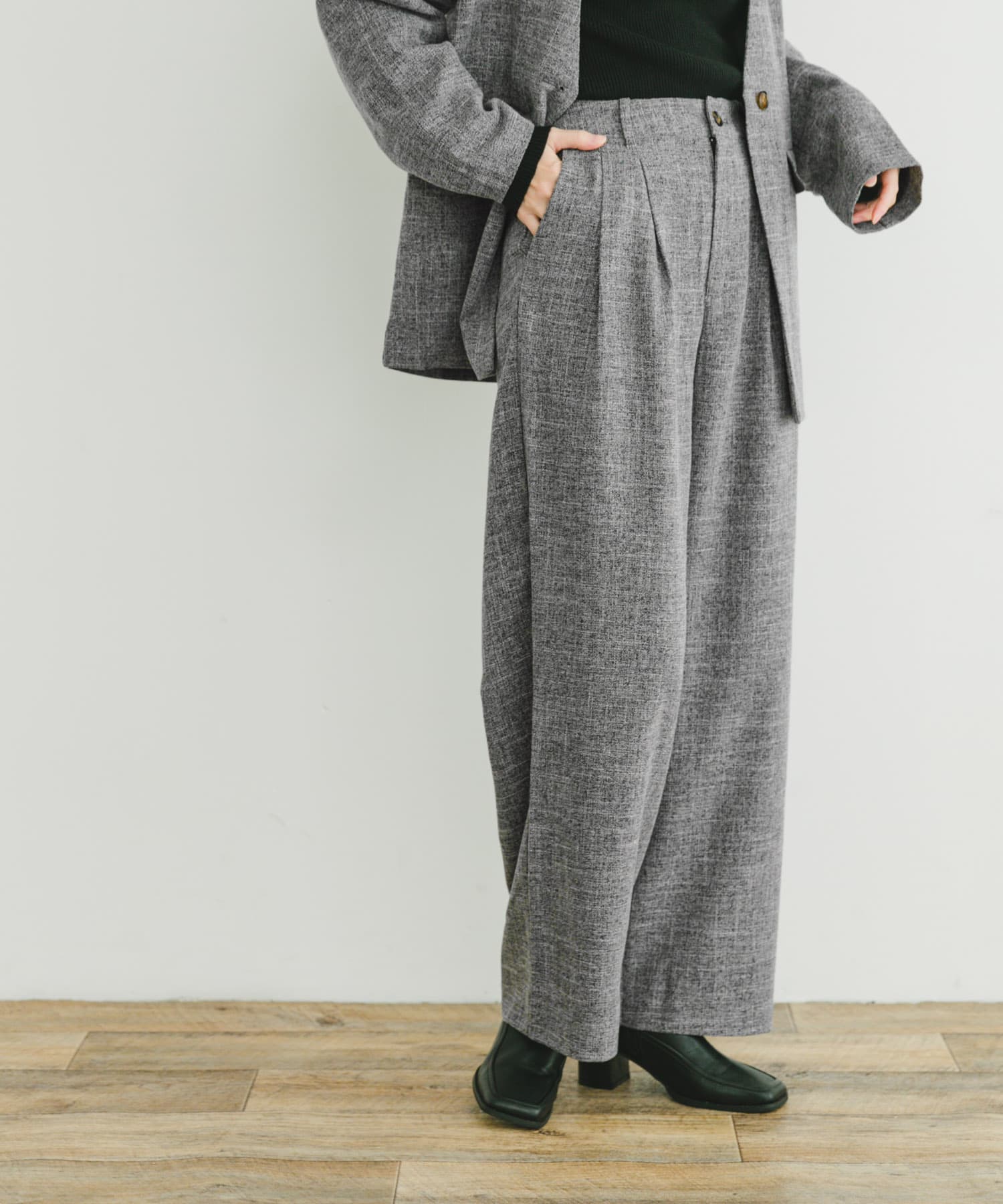 ツイードライクな生地なので実際は軽くさらさらとした着心地です!程よくワイドなシルエットが動きやすくラインも拾わず安心です◎