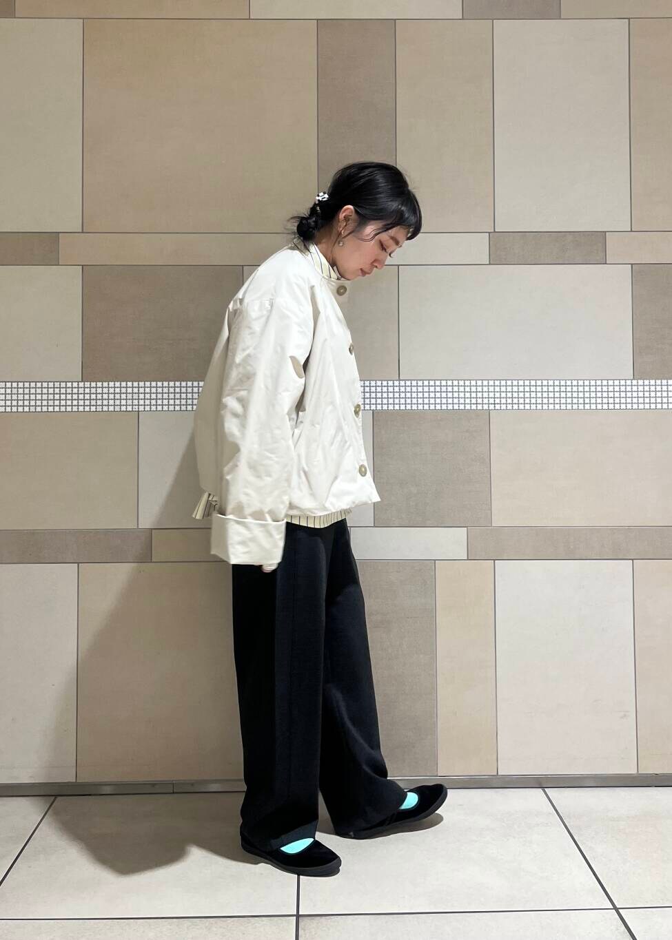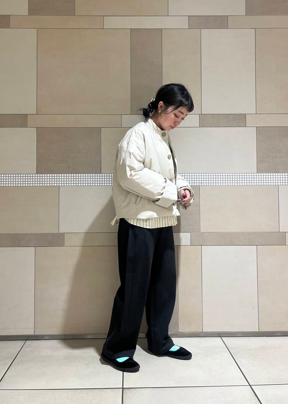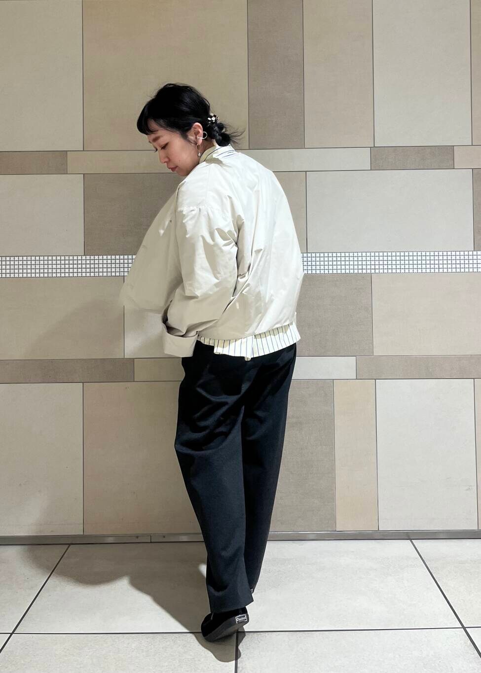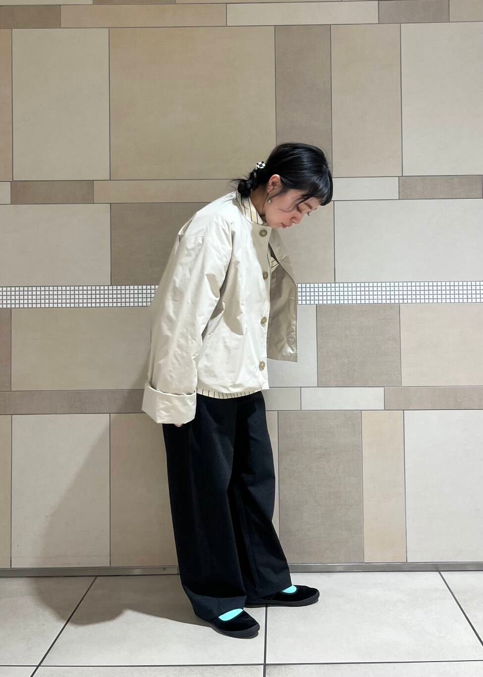 ノーカラーのシンプルなデザインながらも、ショート丈だったり折り返せる袖のボリューム感だったりとさりげなく今っぽい要素も取り入れたデイリーに使いやすい1枚。
