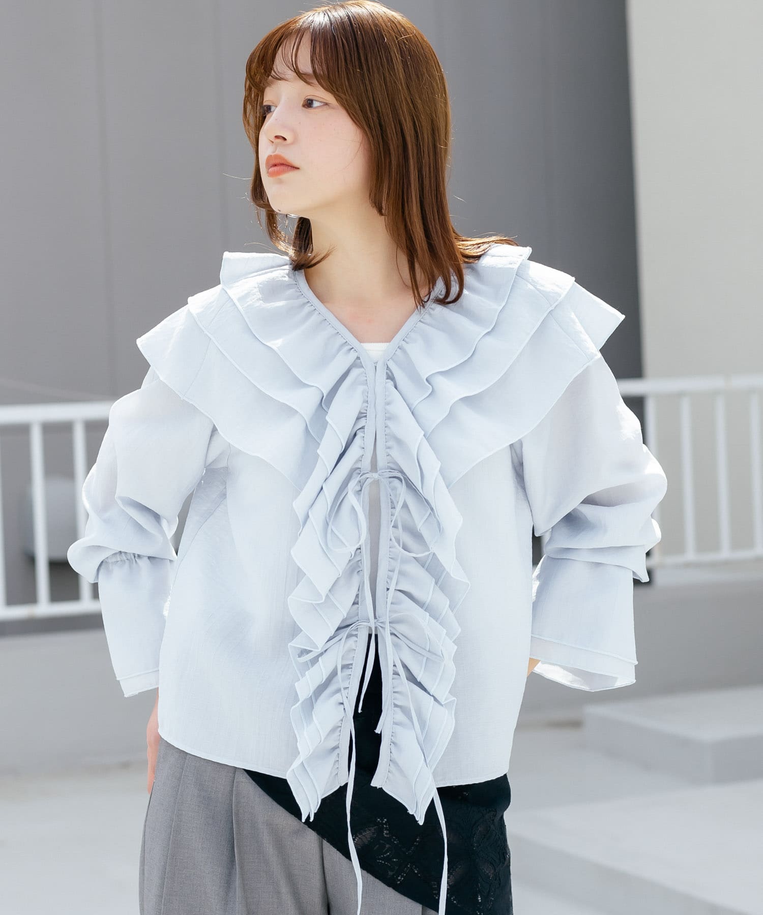 胸元に施されたフリルとリボンディティールが可愛いSSアイテムです!フリルも着たいけど体が大きく見えるかもとお悩みの骨格ストレートの皆さんに朗報です💌こちらのアイテムはしっかりと首元が空いているのでスッキリとした印象で着ていただける&二の腕のムチムチ感を拾わないサイズ感でフリルが二の腕をカバーしてくれるので是非ともオススメしたいイチオシアイテムです🙏🏻
