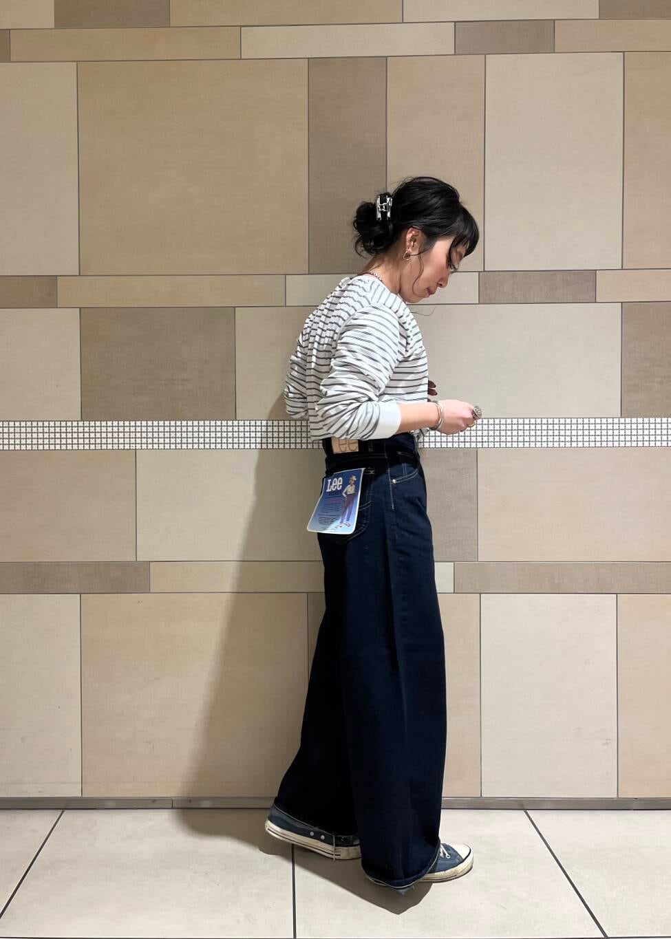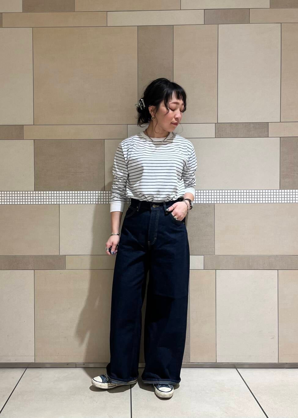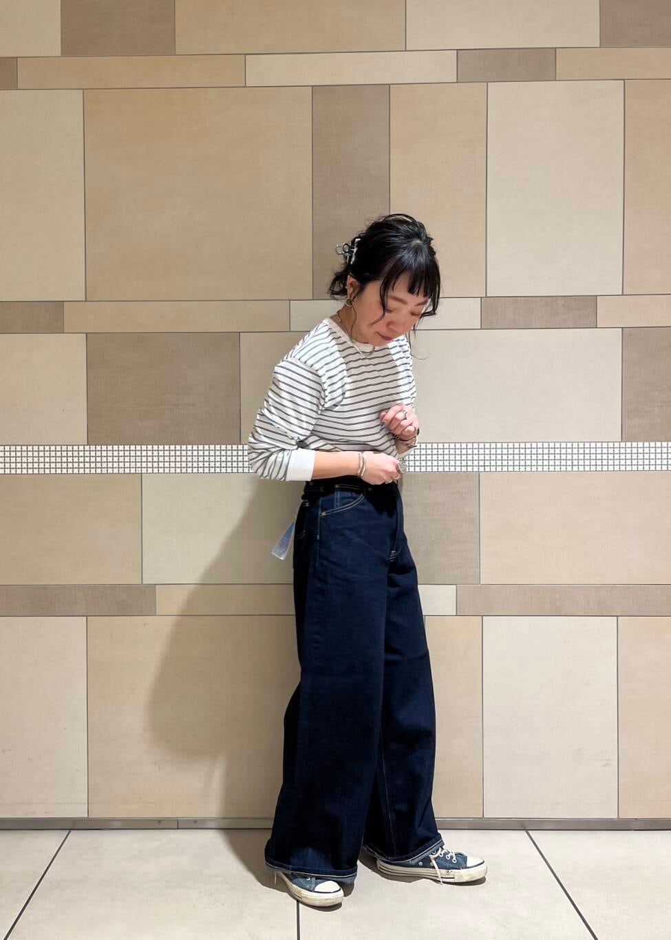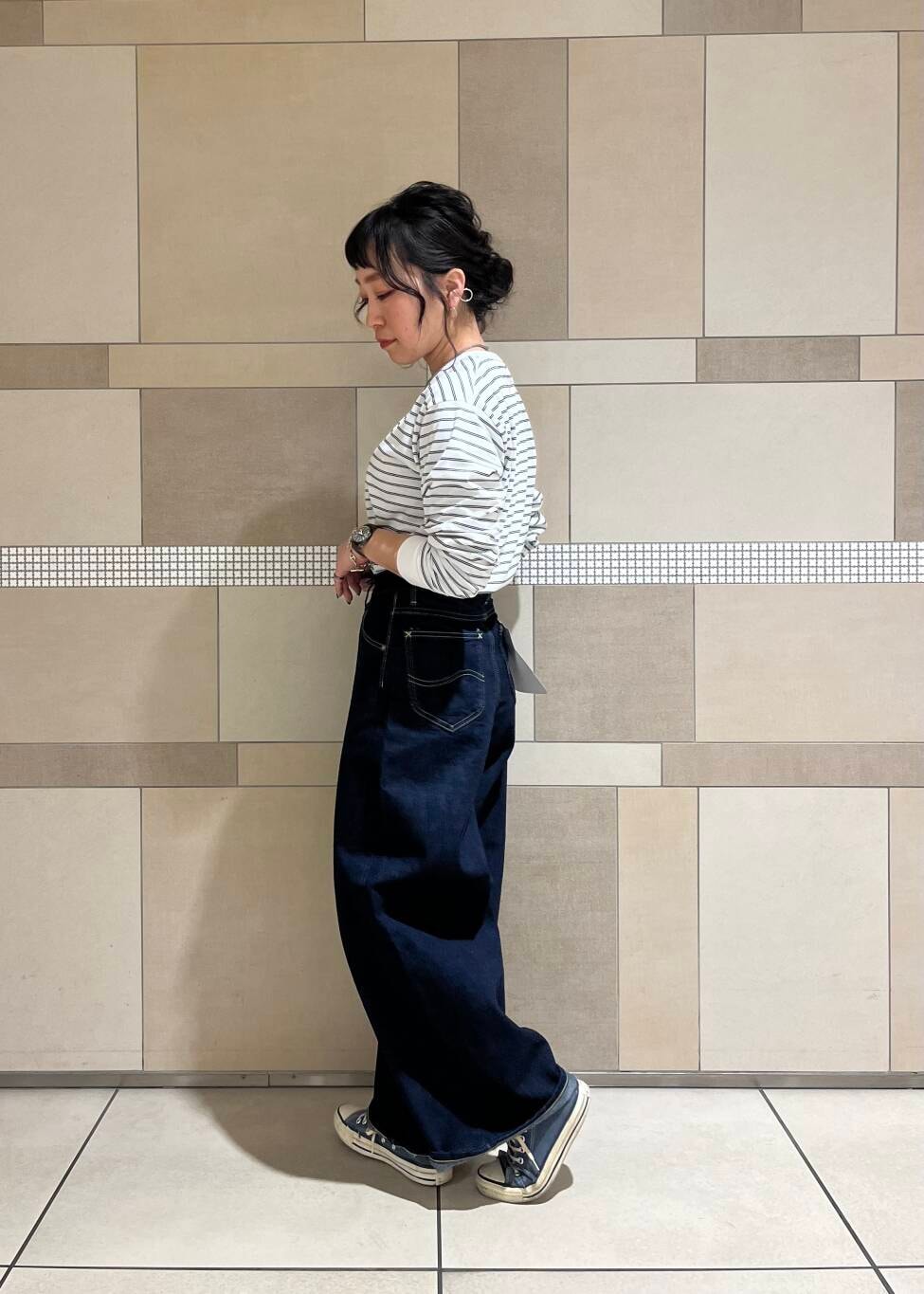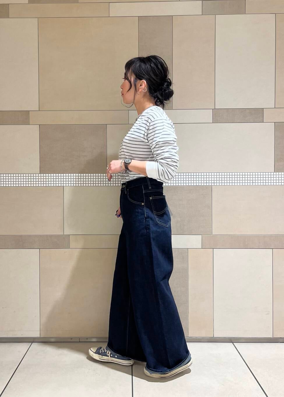 股上深めのウエストと、股下からは余裕のあるまま下までストンと落ち感のあるデザインで、体型カバーもしながらかなりの美シルエットで履ける一本!