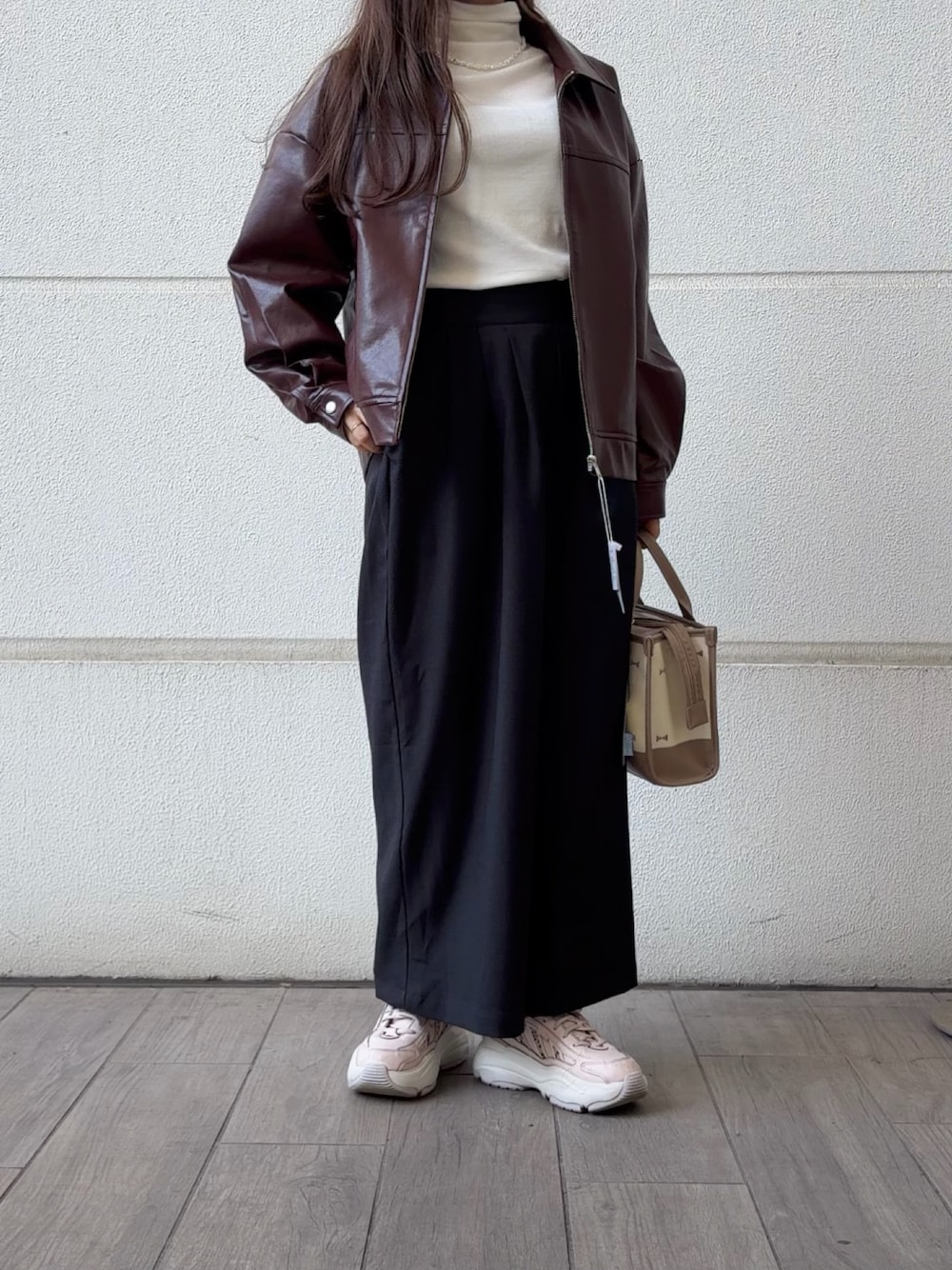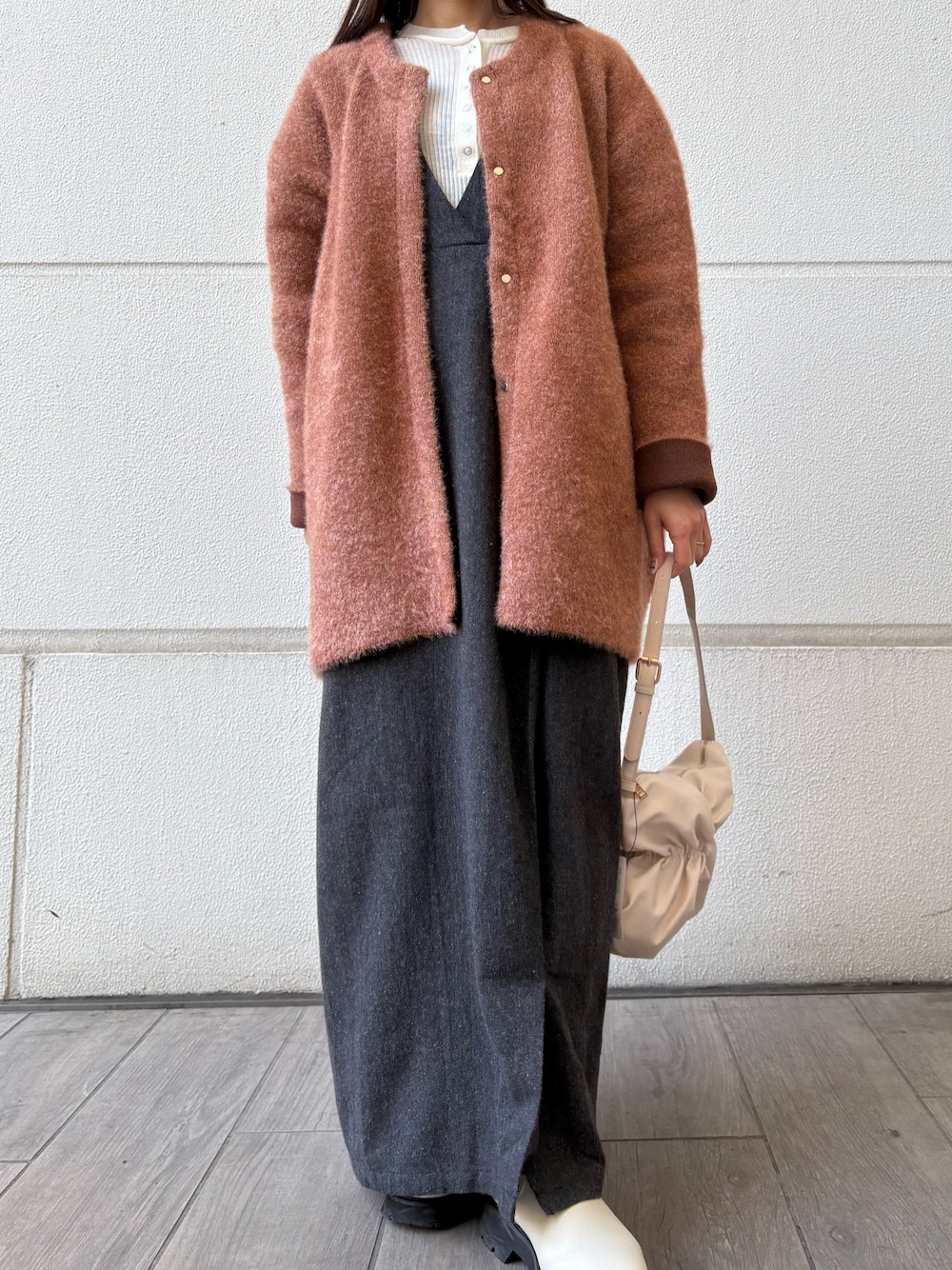 丈の短いアウターをワンピースに合わせると足長効果で着ることができます。